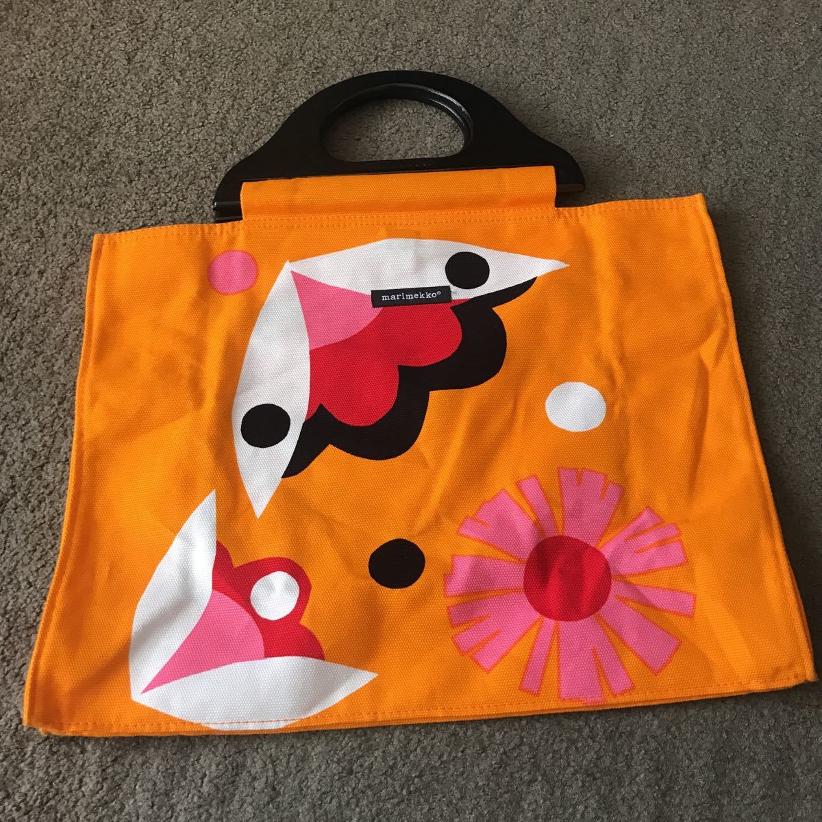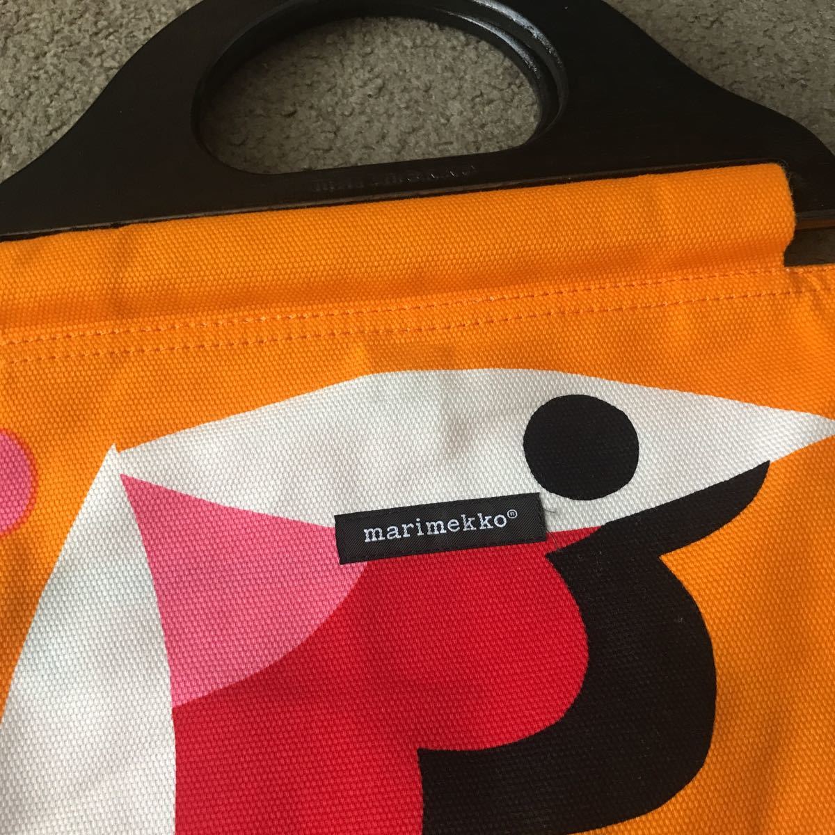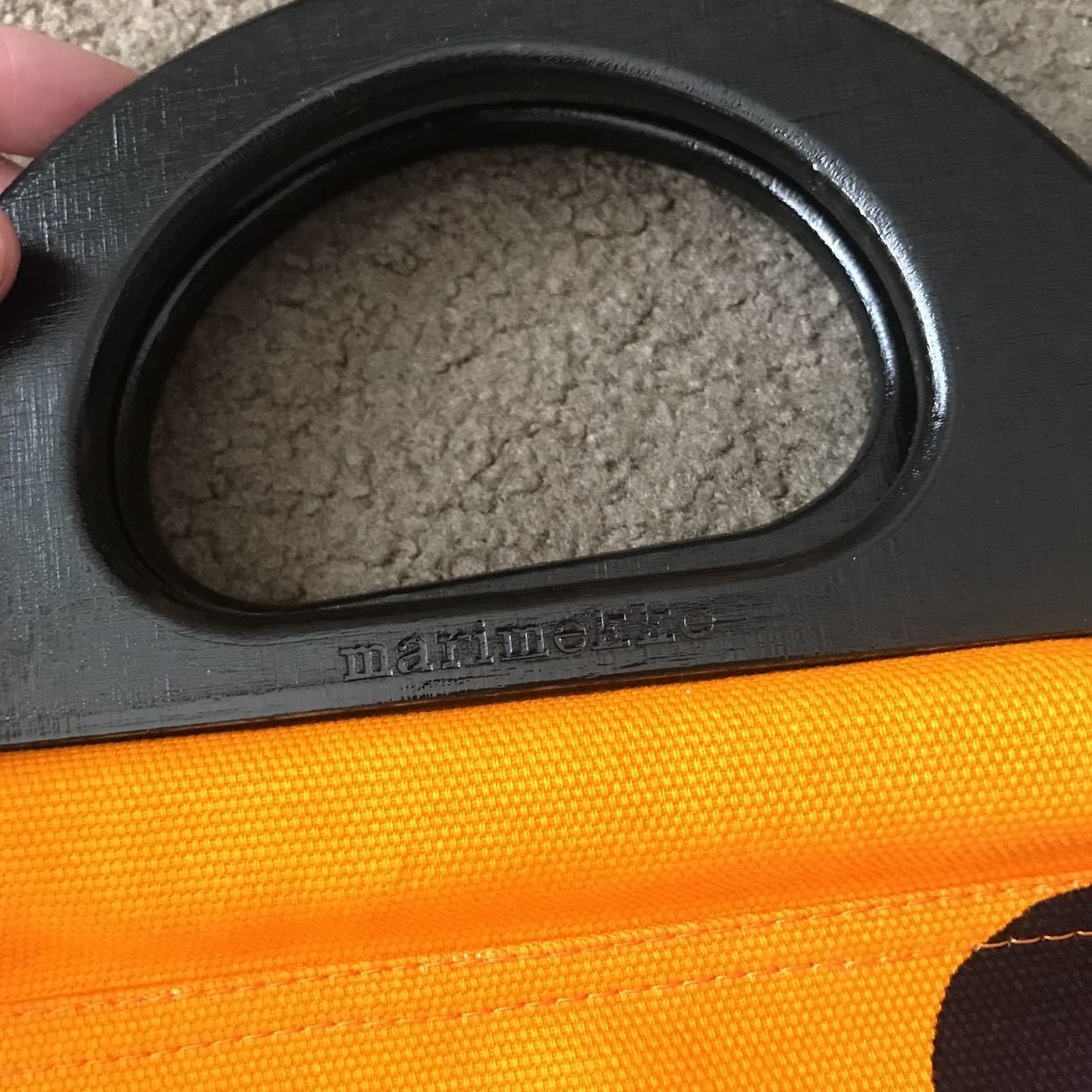 新品 日本限定モデル マリメッコハンドバッグです。フィンランド製、綿100%、持ち手は木製です。実寸は41×32×15cmです。若干の保存汚れはご容赦ください。探していた方、この機会に如何ですか?