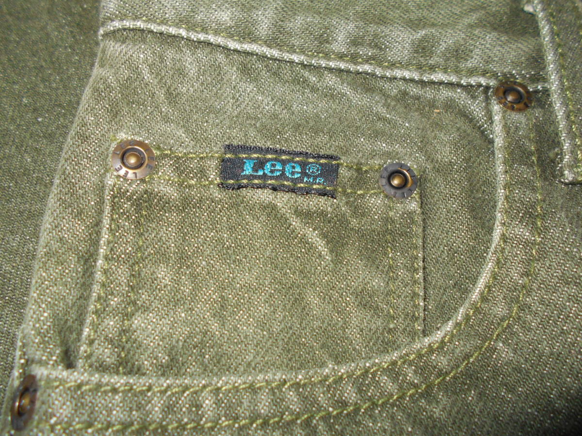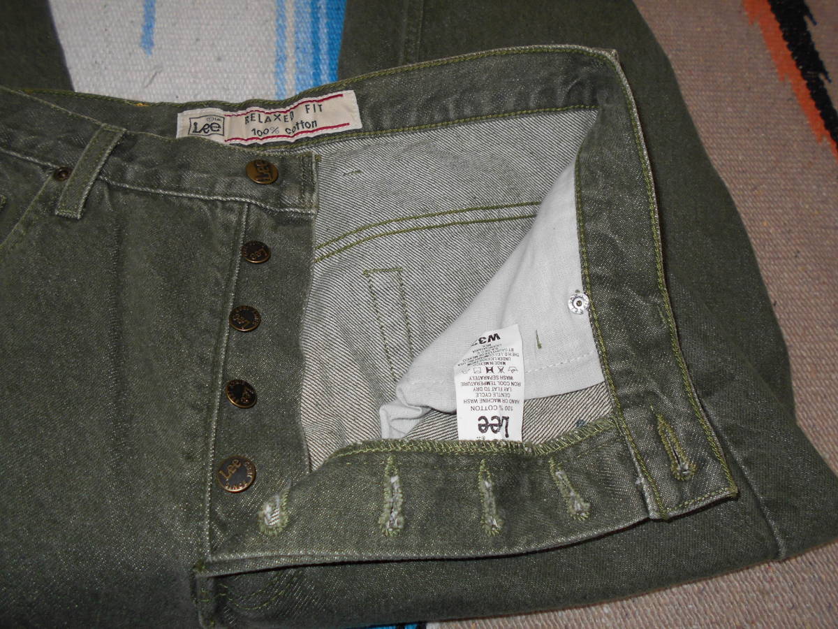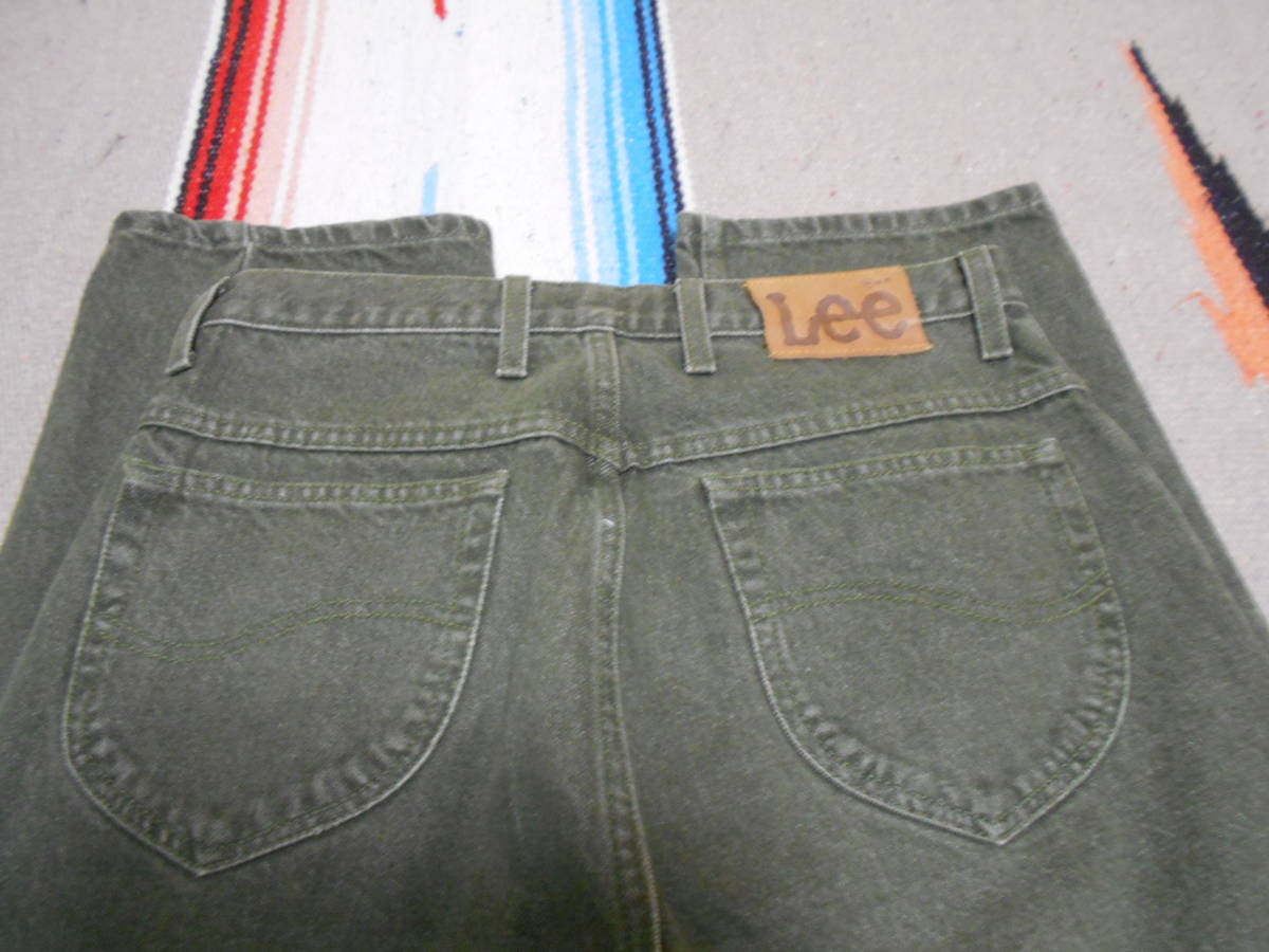 Lee USA RELAXED FIT 特有のワタリ幅に余裕があり裾はややスリムなルーズ過ぎない履き易いシルエットライン、ハイオンスのセージグリーンデニム素材感、重厚な本革レザーパッチ、ボタンフライ 等等...ディテールが極めて良い風合い