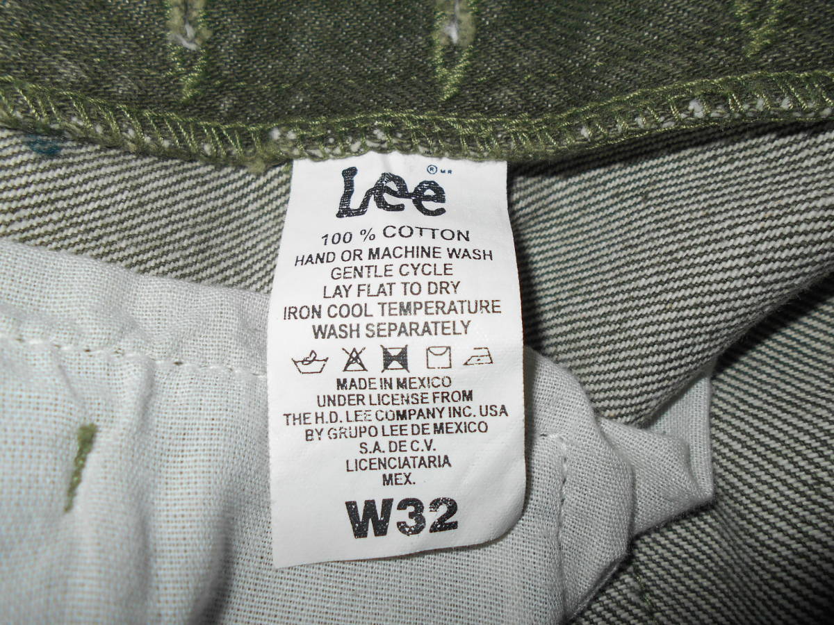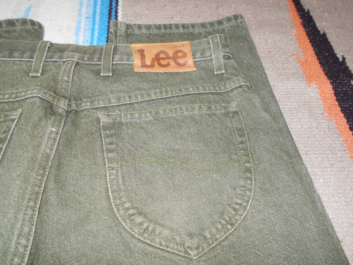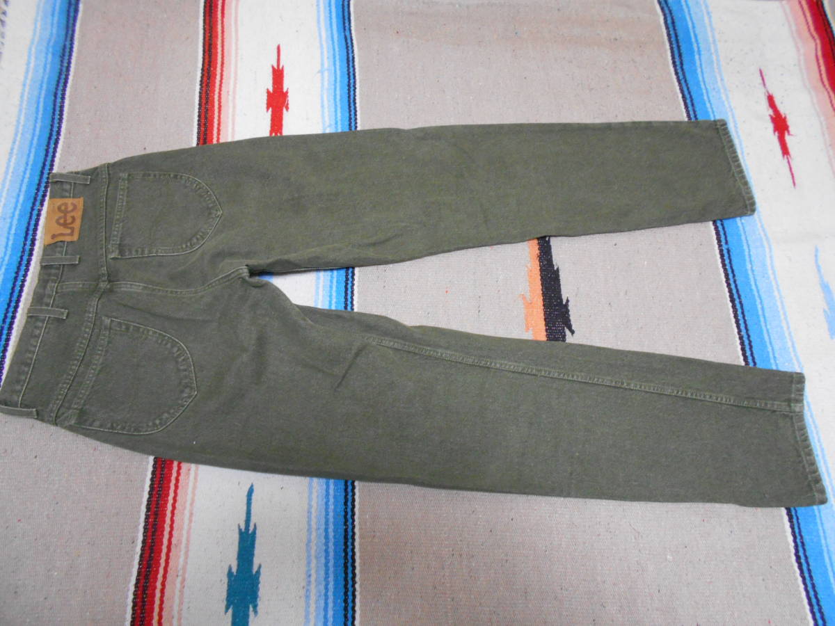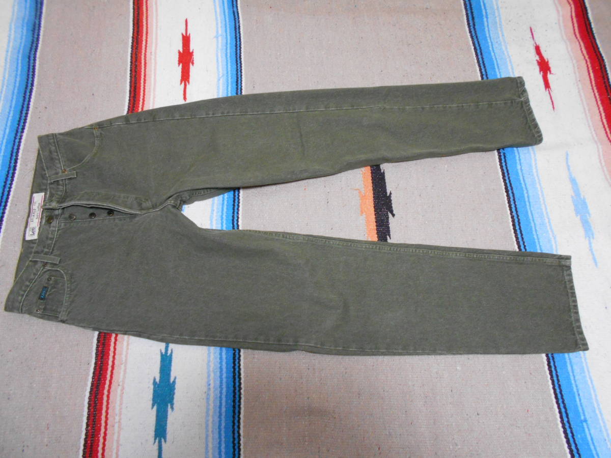 Lee USA RELAXED FIT 特有のワタリ幅に余裕があり裾はややスリムなルーズ過ぎない履き易いシルエットライン、ハイオンスのセージグリーンデニム素材感、重厚な本革レザーパッチ、ボタンフライ 等等...ディテールが極めて良い風合い