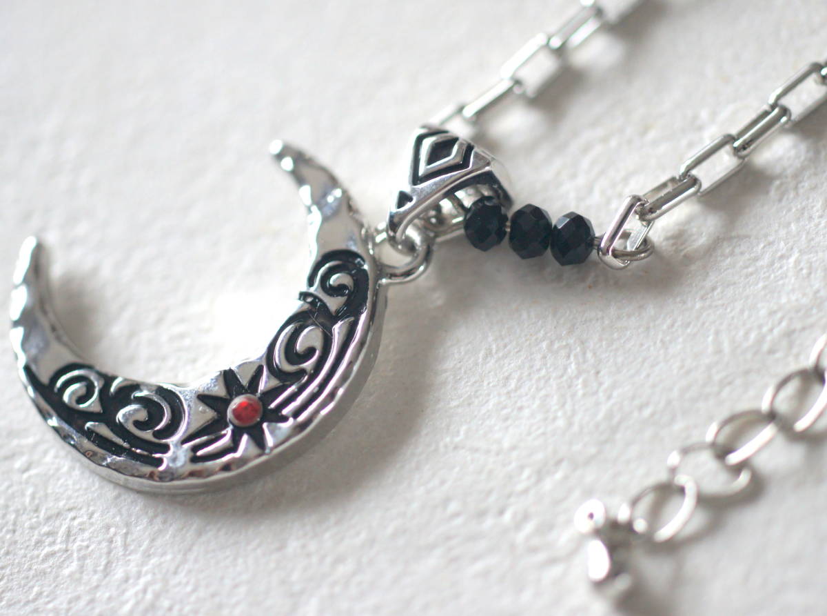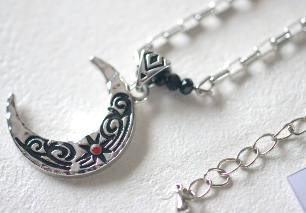 新品未使用 模様と赤い石付き三日月のネックレス 黒いビーズ付き