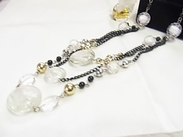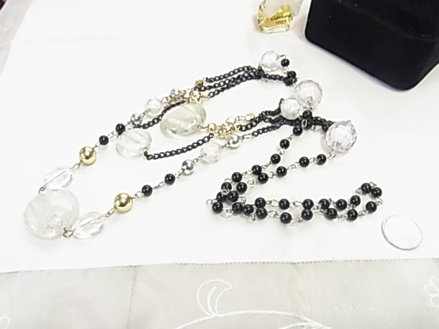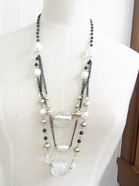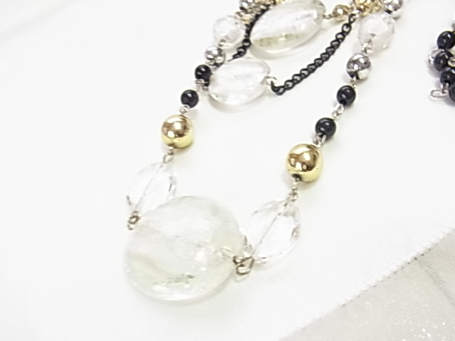 モノトーンデザイン ガラスストーンと黒と金のビーズストーン 3連調 ロングネックレス△△