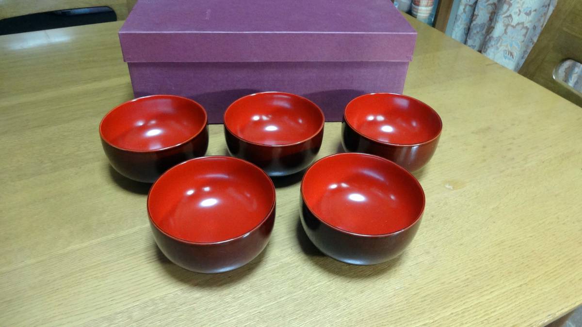 山中塗 外溜塗、内朱塗、縁切立の汁椀5個組未使用品です。