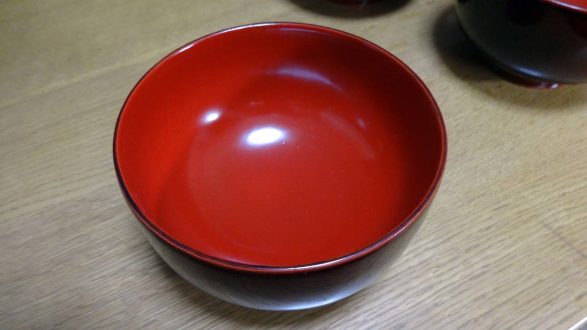 山中塗 外溜塗、内朱塗、縁切立の汁椀5個組未使用品です。