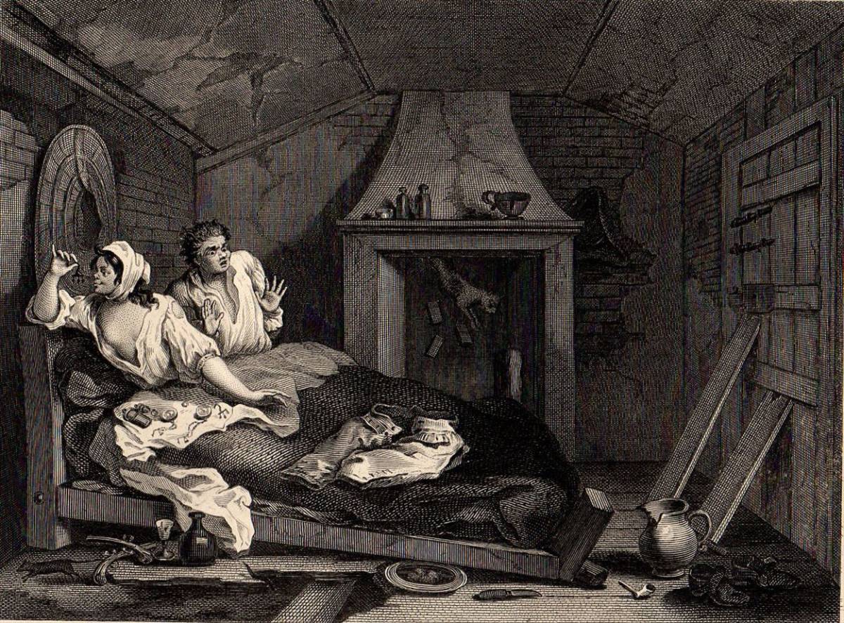 1871年 Hogarth ホガース 鋼版画 勤勉と怠惰7 流刑を終えるや、屋根裏部屋で娼婦と寝る生活に