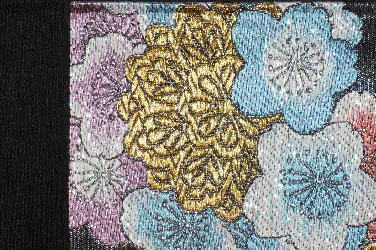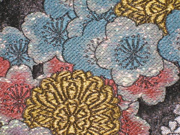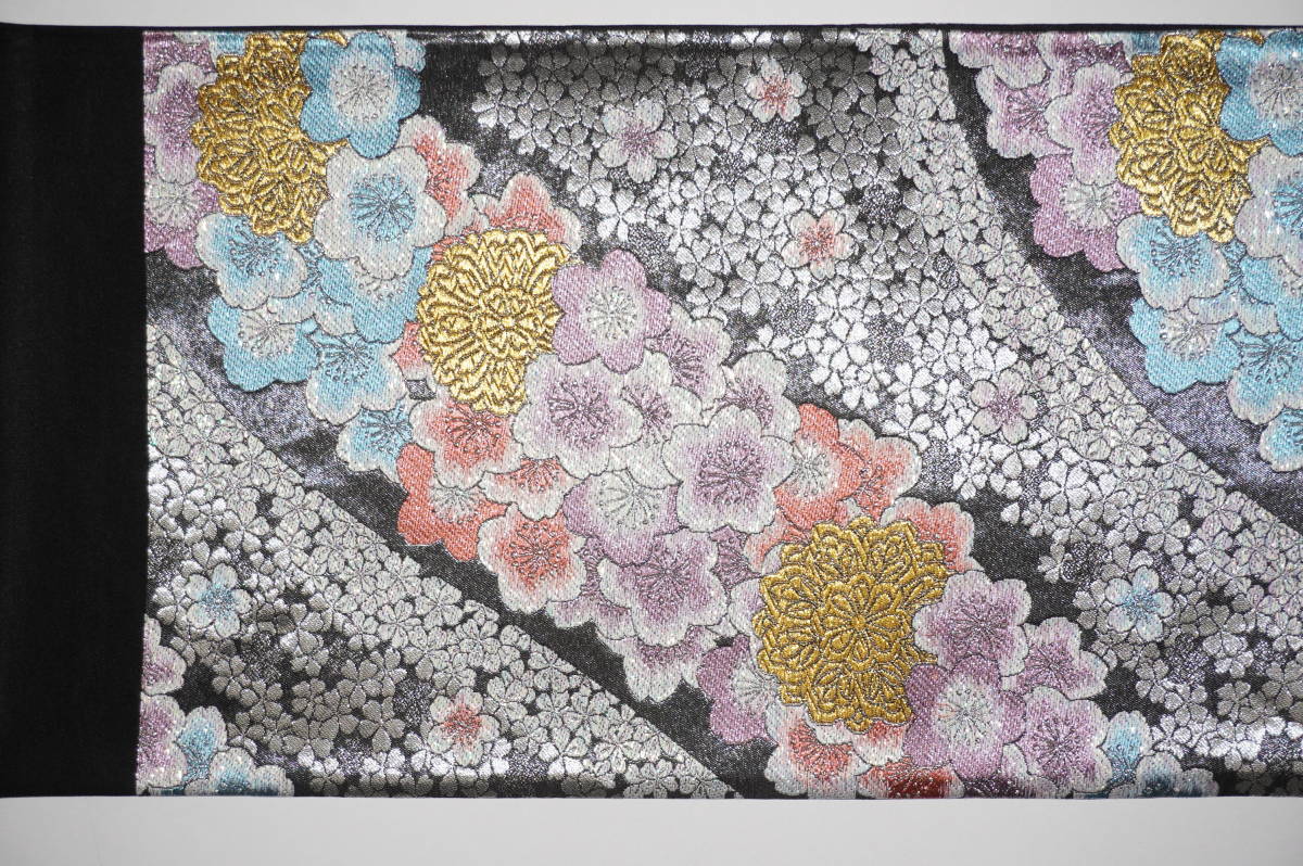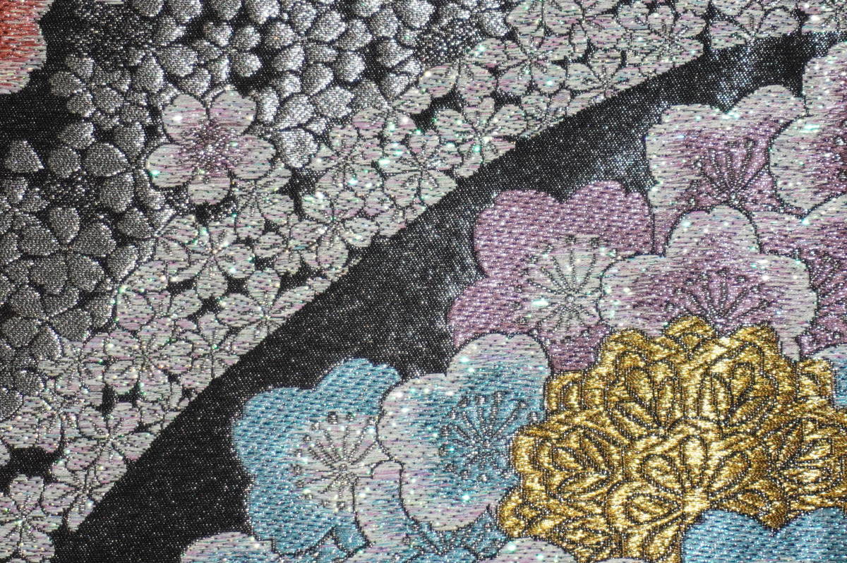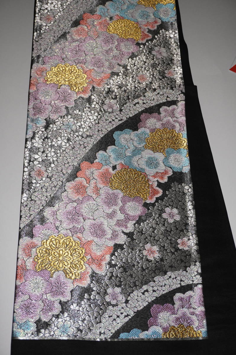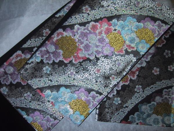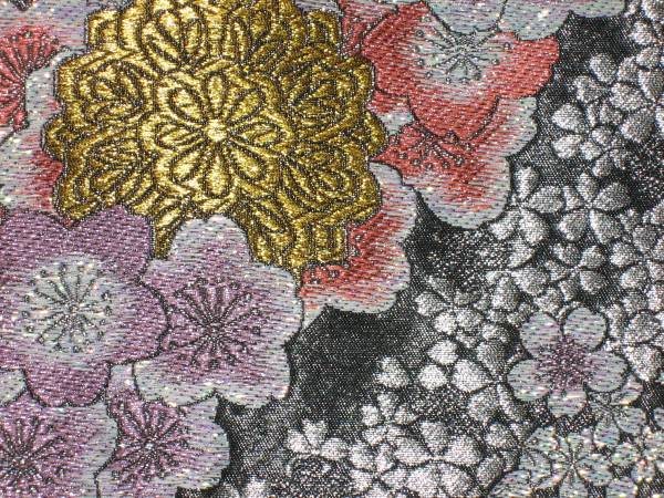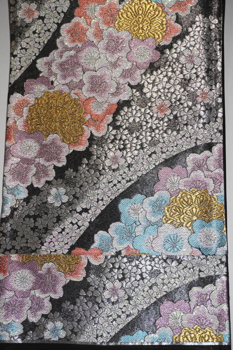 なお、帯柄左上に無地で出ているところは裏無地で、柄と柄の間に出ているところは手先と前太鼓のあいだの無地部分です。六通柄です。金銀糸が多用されているためストロボの照りで、しろぽく写っている部分があります。