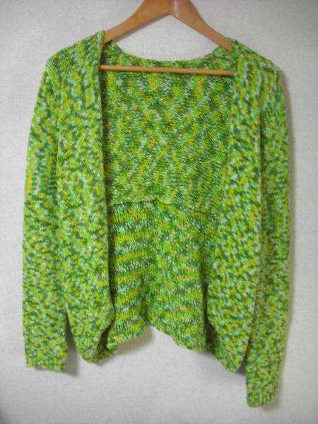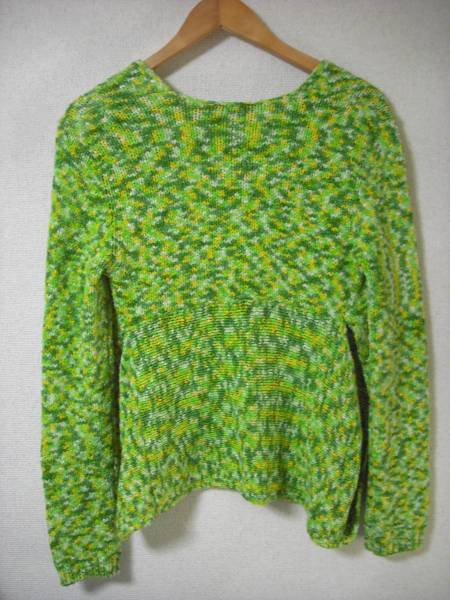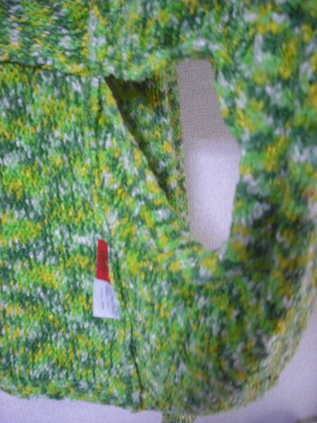 写真のような編み込んだ洋服になります。 写真2枚目の様に赤いブランドタグがございますが、アルファベットの崩し字なのか、デザインなのか、当方には読めず、わかりません。 私見ですが、黄緑、緑、白の糸の束が編み込まれているようです。 両腰部分に腕を通せるくらいの空間があります。(写真2枚目参照) サイズは2 ナイロン100% 株式会社イッセイミヤケ 日本製 HA51KJ378 おおまかですが・・・着丈55cm、身幅43cm、袖丈67cmくらいです。 写真の状態でメジャーで測っています。 編み込んだ生地になり、偏り、ホツレが見受けられます。 保管中の汚れ、畳みジワ、経年劣化、他商品と触れあっているため糸クズの付着などございますし、中古であり、個人所有になりますので糸のほつれ、汚れやスレなどの痛みがある場合もございます。 現状でよろしくお願いします。 約560g 簡易包装の規格外の定形外郵便1kgか、ギュッと詰めてレターパックプラスで発送予定です。 |