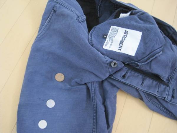 アタッチメント ハンパ丈パンツ サルエル風  硫化染めになります。着用感があり、3枚目の写真のように汚れがあります。カラーはネイビー系、サイズは1、綿100%、日本製です。ポケット口にダメージ加工がしてあります。ウエストは39cm、股下53cm、モモ幅27cm(股下10cmで)、スソ幅16cmです。素人の採寸ですので若干の誤差、商品状態はご了承ください。写っているのが全てです。 落札後は、ノークレーム、ノーリターン、ノーキャンセルでお願いします。 発送方法はゆうぱっく着払いか定形外です。ほかにも色々出品していますので良かったらご覧ください。