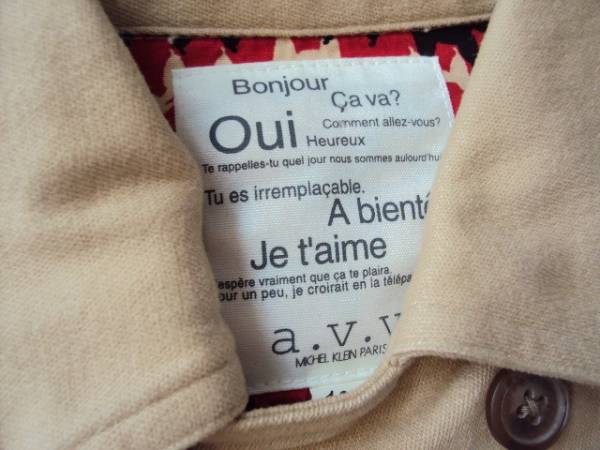 a.v.vミッシェルクランのジャケットです。お色はベージュ系です。サイズは100です。素材は綿99%ポリウレタン1%です。使用品ですので神経質な方は御遠慮下さいね。ノークレームノーリターンでお願い致します。その他いろいろ出品していますので見て下さいね。必ず自己紹介も御覧下さい