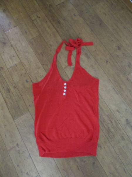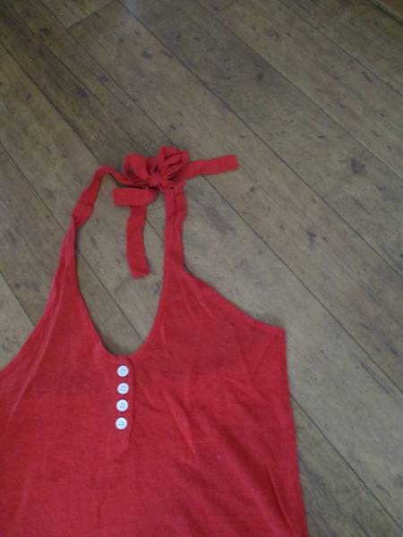 商品紹介 | ラメが混ざった赤いニット素材のホルターネックキャミソールです。 襟元はヘンリーネックのような形でボタンが付いています。 《素材》 麻58% 綿25% 指定外繊維(ポリアミド)17% |