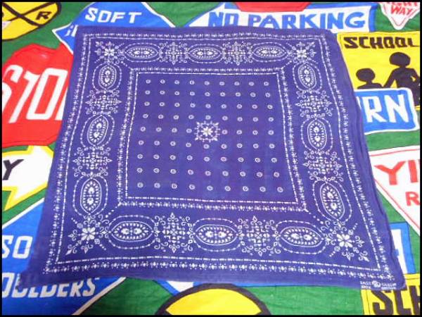 アメリカ物らしい幾何学系のプリントデザインが◎な1枚で、鮮やかな濃紺ボディーにビンテージバンダナらしい柄のパターンがかっこいいです。