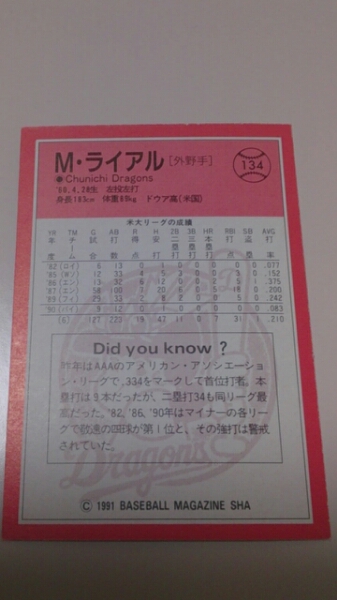 マークライアル!中日ドラゴンズ1991BBM134 |