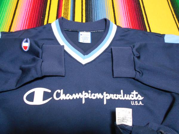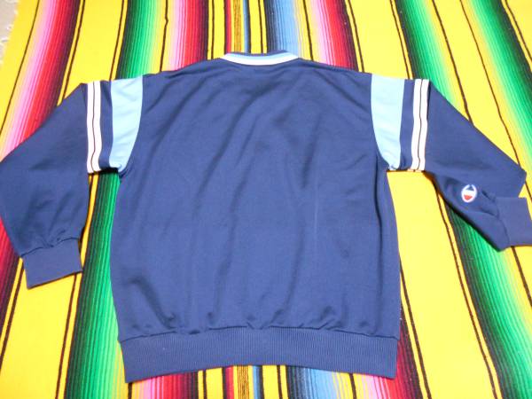 頑丈で速乾性のジャージ素材感や、大きめな胸のチャンピオンロゴ、スリーブ先端の大きいエンブレム、ルーズすぎないシルエット、スカイブルー × ホワイト のツートンライン、タイトVネック 等等... ディテールまで良い感じ