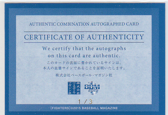 パックから出る直筆サインカードで、3枚のシリアルナンバーが入っています。シリアルナンバーは1/3のファーストナンバーです。
