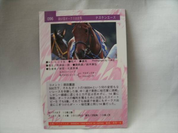 | ☆☆☆商品説明☆☆☆ 【メーカー】 バンダイ 【シリーズ】 96年上半期サラブレッドカード 【番号】 096 ナスケンエース 【レース】 第57回オークス出走馬 【数量】 1枚 サラブレッドカードの第2弾96年上半期カードになります。 |