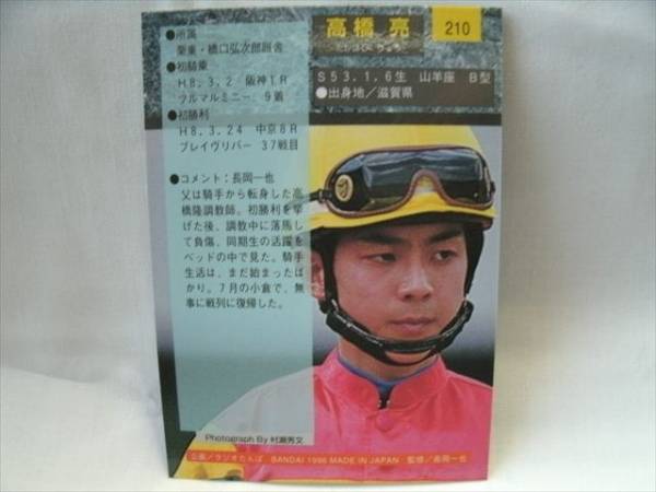☆☆☆商品説明☆☆☆ 【メーカー】 バンダイ 【シリーズ】 96年上半期サラブレッドカード 【番号】 210 高橋亮 【種類】 96ルーキージョッキー 【数量】 1枚 サラブレッドカードの第2弾96年上半期カードになります。 |