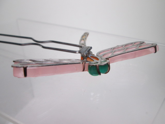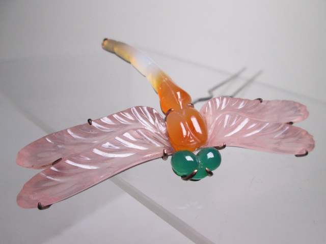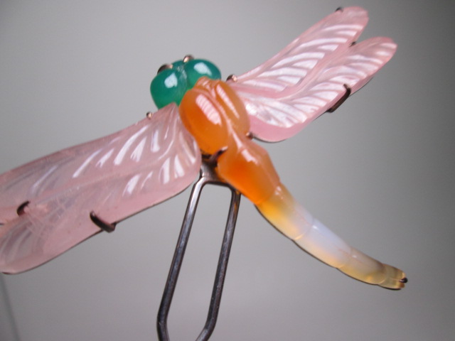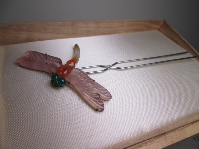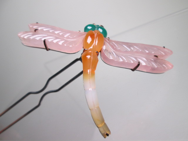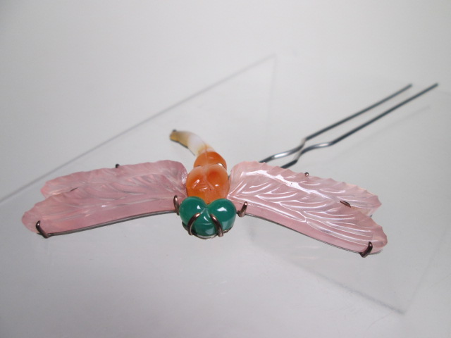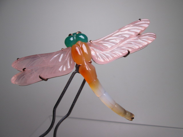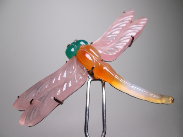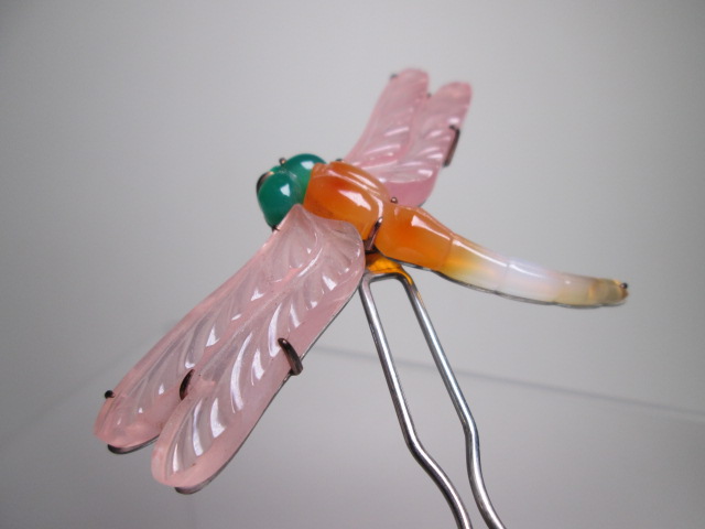 【江月】アンティーク・彫金緑石&紅水晶&瑪瑙の蜻蛉のかんざし 木箱付
