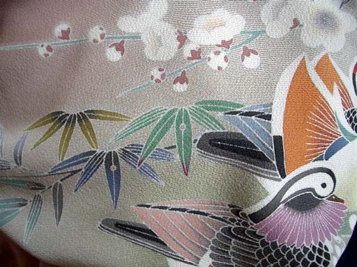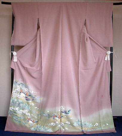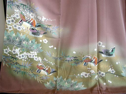 オシドリとおめでたい松竹梅を手描きで描いた友禅の色留袖 です。