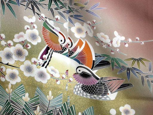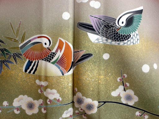 ◆ 後ろ身の柄。 仲むつまじくオシドリの泳ぐ水面は金粉で描かれています。