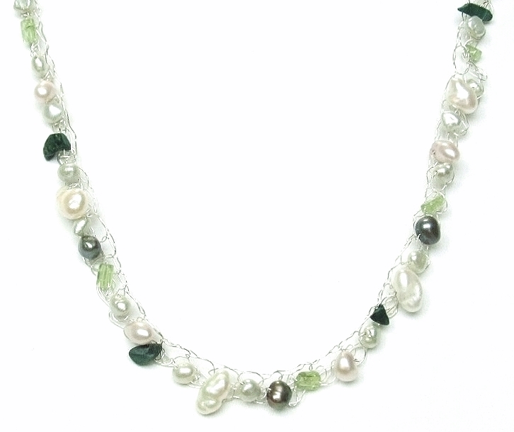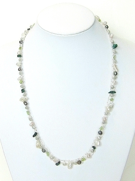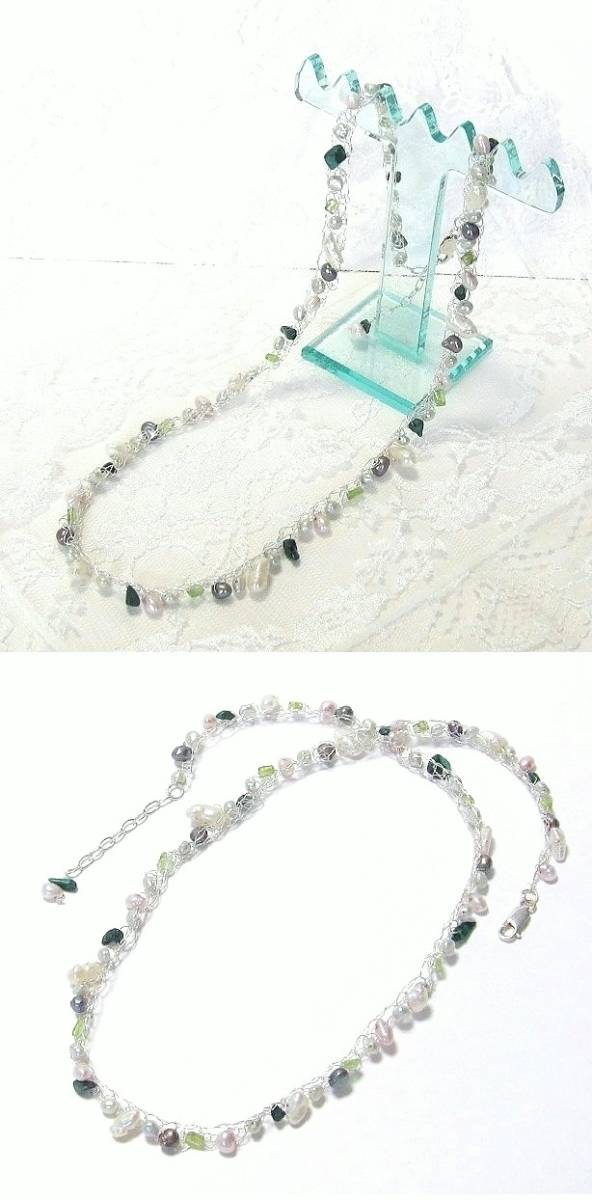 | ハンドメイドの1点物です。 純銀の極細ワイヤーに天然石を編み込んだ、繊細でグレード感のある上品な大人のシルバーネックレス。 さまざまな形の淡水パールを中心に、淡いグリーンのぺリドットと深みのあるグリーンのマラカイトをアクセントにして、一連のロングネックレスに仕上げました。 身につけていることを忘れる位ソフトで軽く、つけ心地抜群です。 極細ワイヤーはとてもソフトなので、指でネックレスの形を簡単に整えることができます。 ★シルバーが黒ずむのが気なる方へ いつまでも美しい輝きを保つ純銀アクセサリーのお手入れ法を同封いたします。 市場ではあまり見かけることがない希少価値のあるアクセサリーです。 素 材:ワイヤー部分・超ソフトタイプの純銀(純度99.9%) 留め金具・シルバー925 淡水パール(淡いピンク系・白系・濃淡グレー)・ペリドット・マラカイト (深みのあるグリーン) サイズ:本体の長さ・54㎝ アジャスター・5㎝ stn-003 市場価格の5割引でご奉仕いたします。 | |||