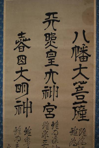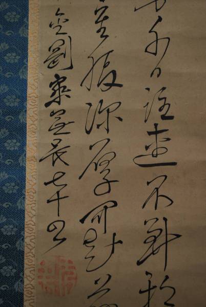 【作品状態】 本紙は紙本肉筆です。本紙は薄汚れ、右上に大きな汚れシミあります。表装は天に多少の汚れシミあります。巻裏に多数の糊シミあります。