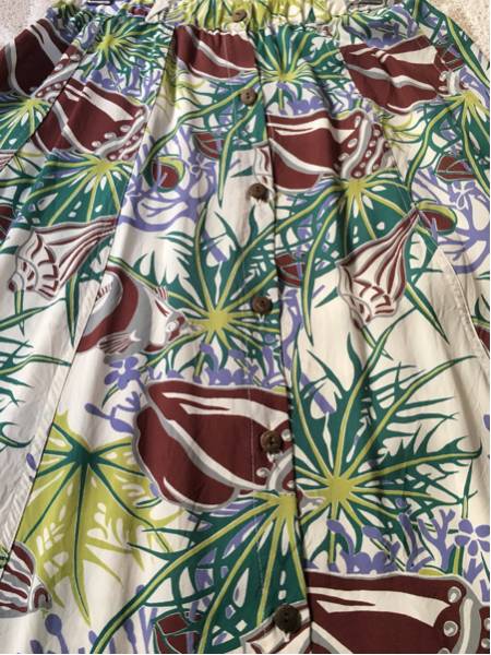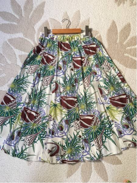 横浜のハワイアンシャツの老舗マウナケアギャラリーズのスカート。前ボタン、ゴム。貝殻と魚の模様が可愛い。定形外予定。レーヨン。