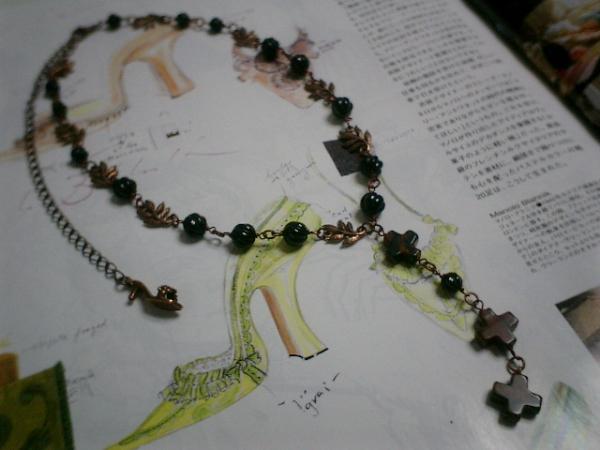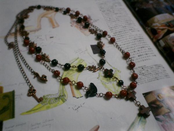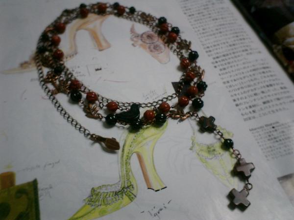 パリの裏通り(?)をイメージして!レッドジャスパーと輝く星のようなブルーサンドストーンの小鳥さんのネックレスとマホガニーオブシディアンのクロスとオニキスのネックレスの2本セットです!お揃いで着けて頂きたいのでセットにしました♪シックな煉瓦色のレッドジャスパーは8ミリのSラインです。間に挟んだ小鳥さんは20×13ミリ位です♪長さは全長73センチ位で調節自由です。画像のように2連にしたり、ぐるぐる巻いてブレスレットにしても可愛いです♪アンテークな雰囲気のマホガニーオブシディアンのクロスは12ミリ角です。オニキスの8ミリと6ミリのこちらもSラインです。間に葉っぱのチャームを挟んでいます♪長さは全長56センチ位で調節自由です♪トップは8センチ位です。ハンドメイドをご理解頂いてノークレーム、ノーリターンでお願いします