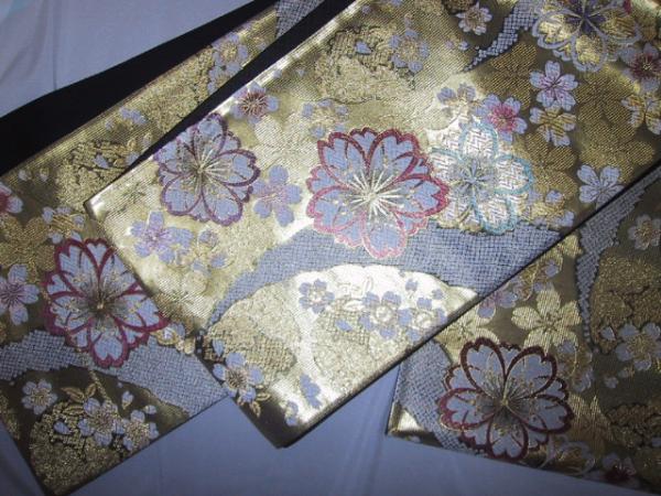なお、帯柄左上に無地で出ているところは裏無地で、柄と柄の間に出ているところは手先と前太鼓のあいだの無地部分です。六通柄です。金銀糸が多用されているためストロボの照りで、しろぽく写っている部分があります