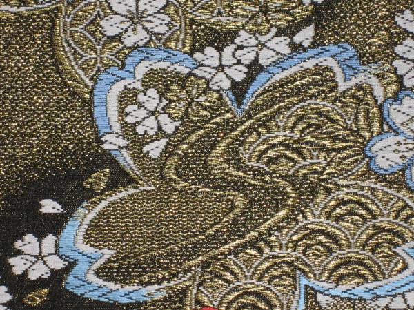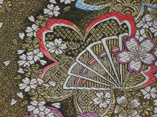 なお、帯柄左上に無地で出ているところは裏無地で、柄と柄の間に出ているところは手先と前太鼓のあいだの無地部分です。六通柄です。金銀糸が多用されているためストロボの照りで、しろぽく写っている部分があります