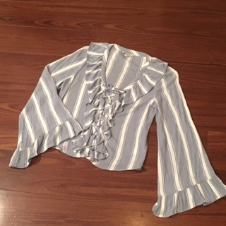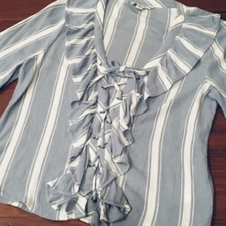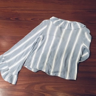【AMERICAN EAGLE OUTFITTERS】 ストライプ フリルトップス size/ XS ブルーグレー アメリカンイーグル ブルーグレー×オフホワイト ショート丈のトップスになります。 着用回数は少なめです。 目立つ汚れ、ダメージはありません。 幅:約41cm 丈:約52cm レーヨン100% |