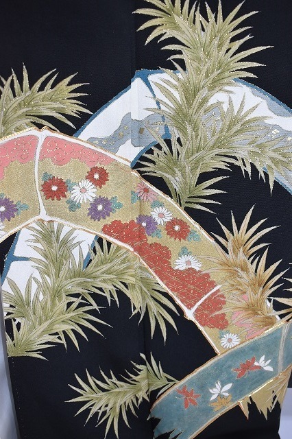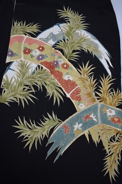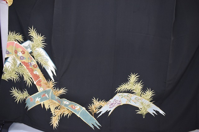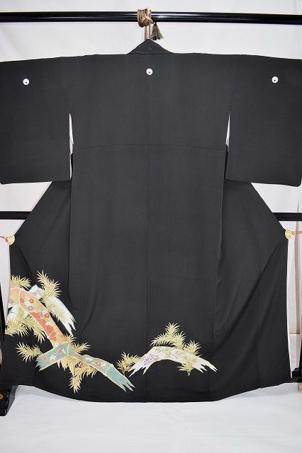 黒留袖 正絹 5つ紋 広衿 植物文 比翼付 身丈149cm 中古美品 kut15★喜香★