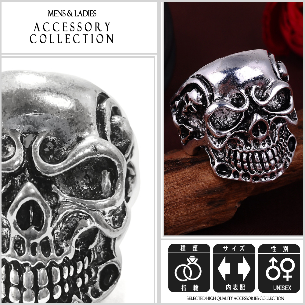 ハードな雰囲気を全体から醸し出す 大きめのスカルフェイスリング。 インパクト抜群の厳つい表情のデザインと 細部まで繊細な作りが同居するリングです。 | |