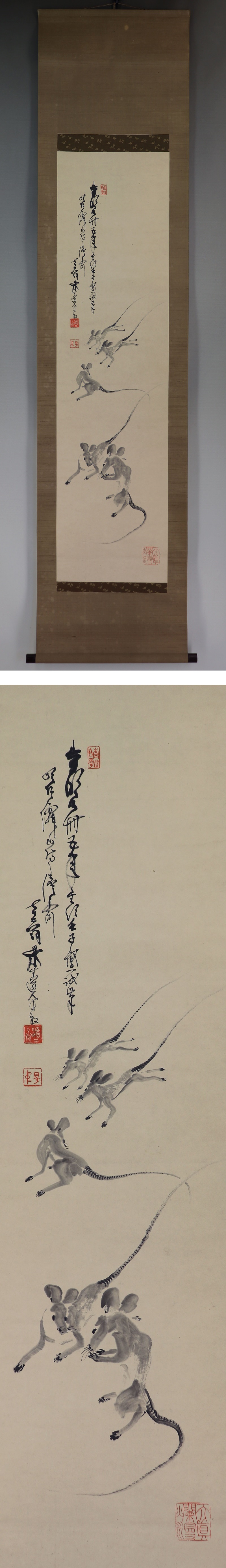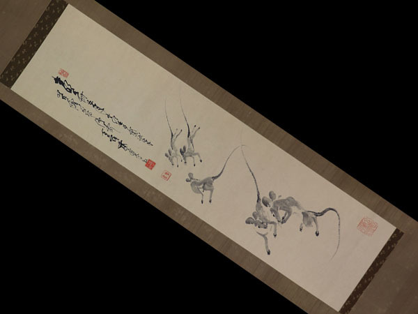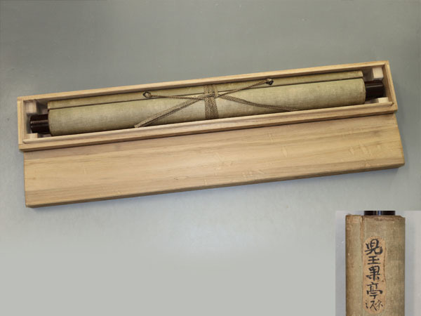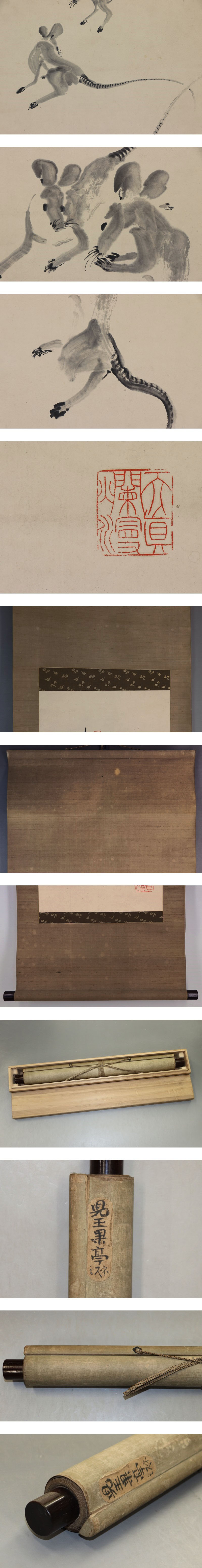 児玉果亭 こだま-かてい(1841-1913) 明治時代の日本画家。 天保(てんぽう)12年1月30日生まれ。はじめ郷里信濃(しなの)(長野県)で佐久間雲窓にまなび, のち田能村直入(たのむら-ちょくにゅう)に文人画をまなぶ。 明治13年郷里に竹僊(ちくせん)山房をつくり,菊池契月(けいげつ)らおおくの弟子をそだてた。 19年の東洋絵画共進会で銀賞。大正2年1月14日死去。73歳。字(あざな)は士毅。別号に果堂,果道人。 本紙は、軽い染み、汚れ、折れ、皺があります。 表装は、染み、汚れ、皺、虫食、剥がれ、軸先に汚れがあります。 【サイズ】 作品 横約34cm×縦約131cm 表装 横約46cm×縦約198cm |