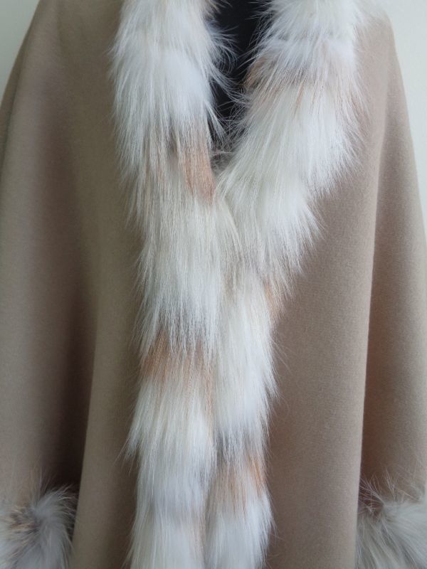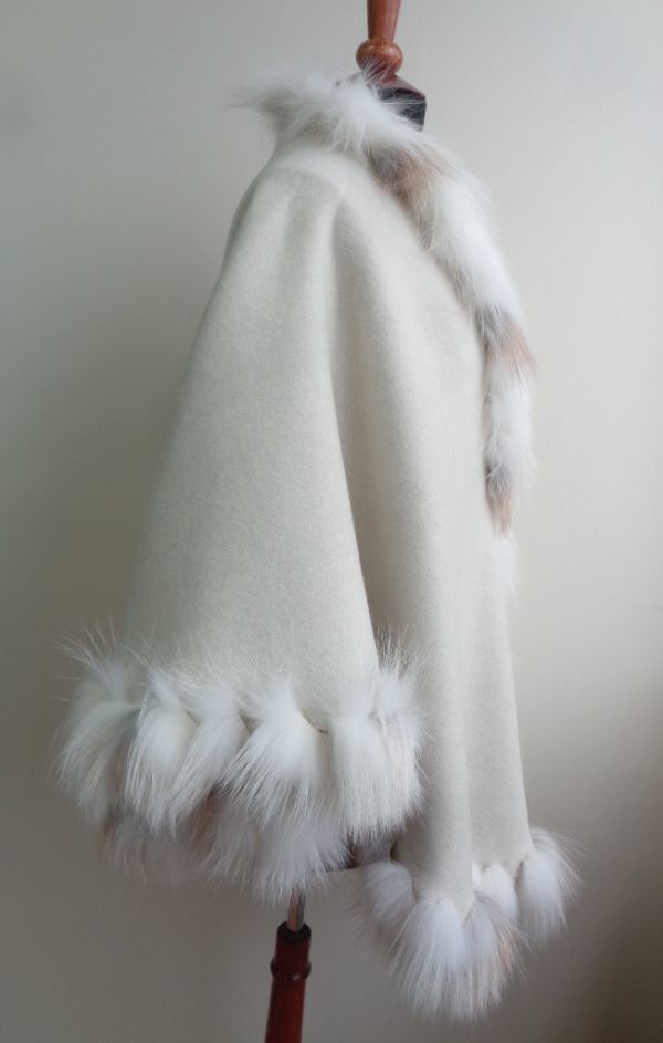 • ベージュ&ホワイトのウール・リバーシブル・ケープ。フォックス・ファーのトリミング。スナップボタン&チェーンの留め具つき。
