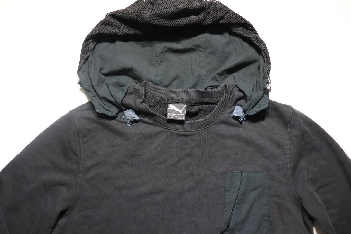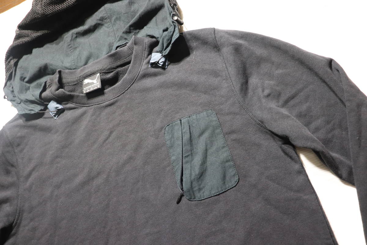プーマのフードが取り外し可能なスウェットです。色は黒で素材は綿80%、ポリエステル20%です。▲程度:USEDですが破れやダメージになるような汚れ等はありません。古着を理解していただける方の入札を希望いたしますは。サイズ:USサイズのMで実寸では(肩幅:49センチ、袖丈:70センチ、着丈69センチ、身幅56センチです)▲他にも多数出品していますので、一度ご覧ください。