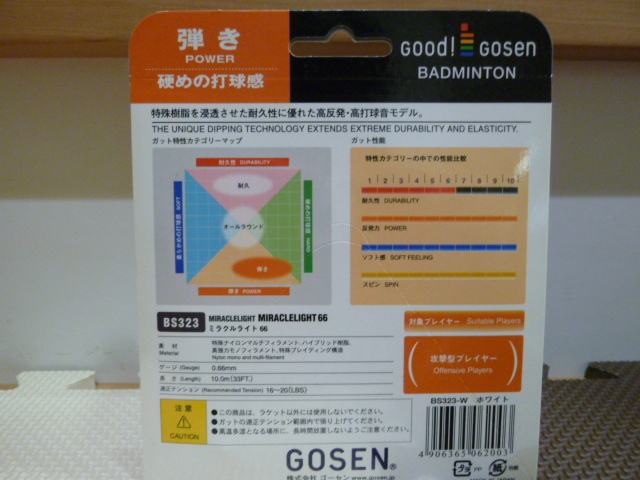 ■ ゴーセン GOSEN    ■ミラクルライト66    ■BS323-W    ■ホワイト    ■硬めの打球感         ■新品