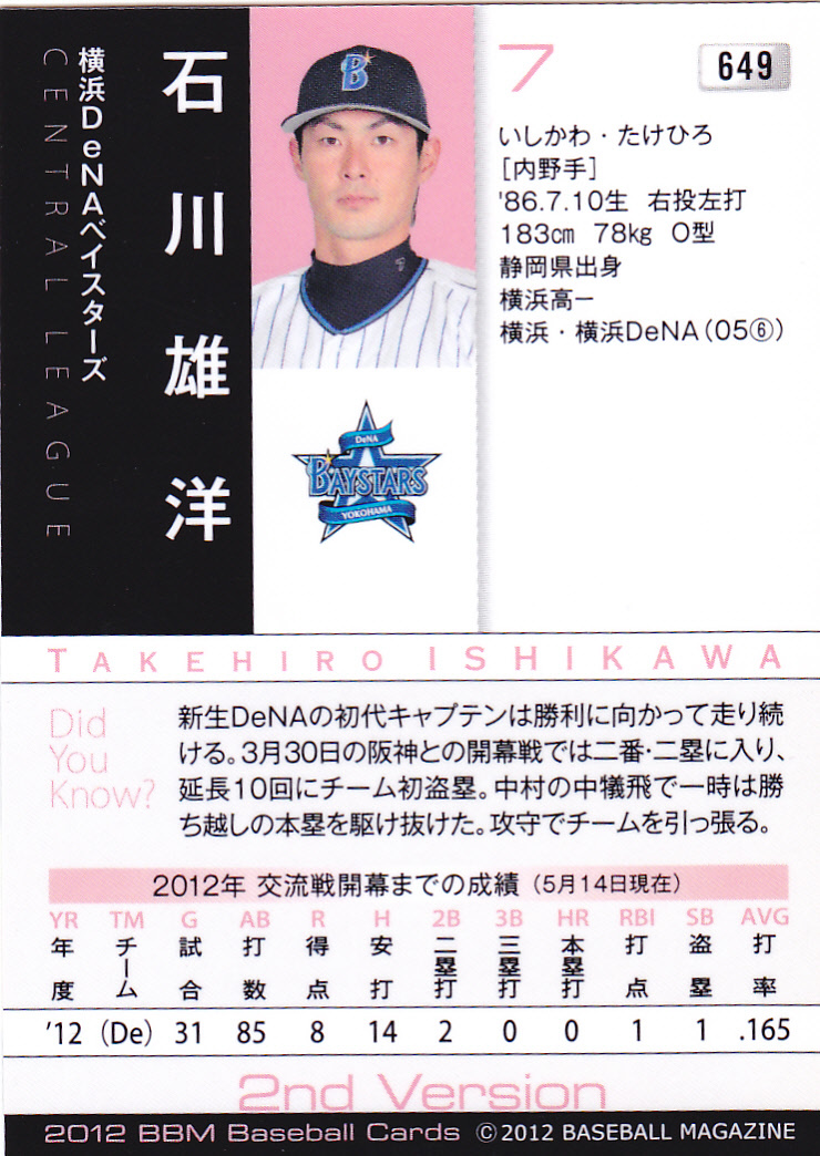BBMベースボールカード 2012-2nd 649 石川雄洋 静岡県 横浜高校 横浜DeNAベイスターズ