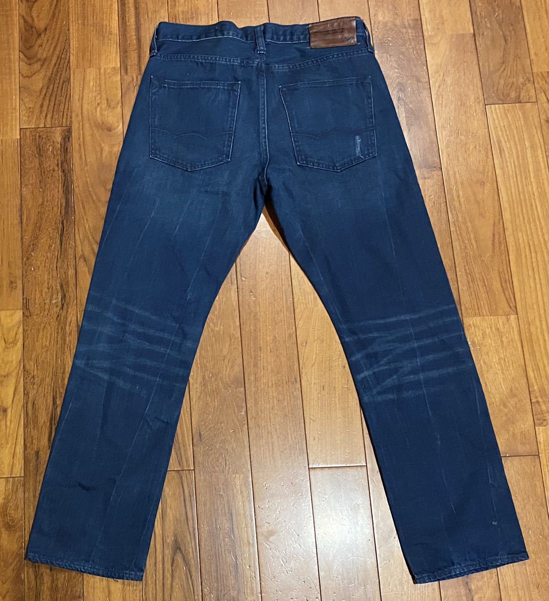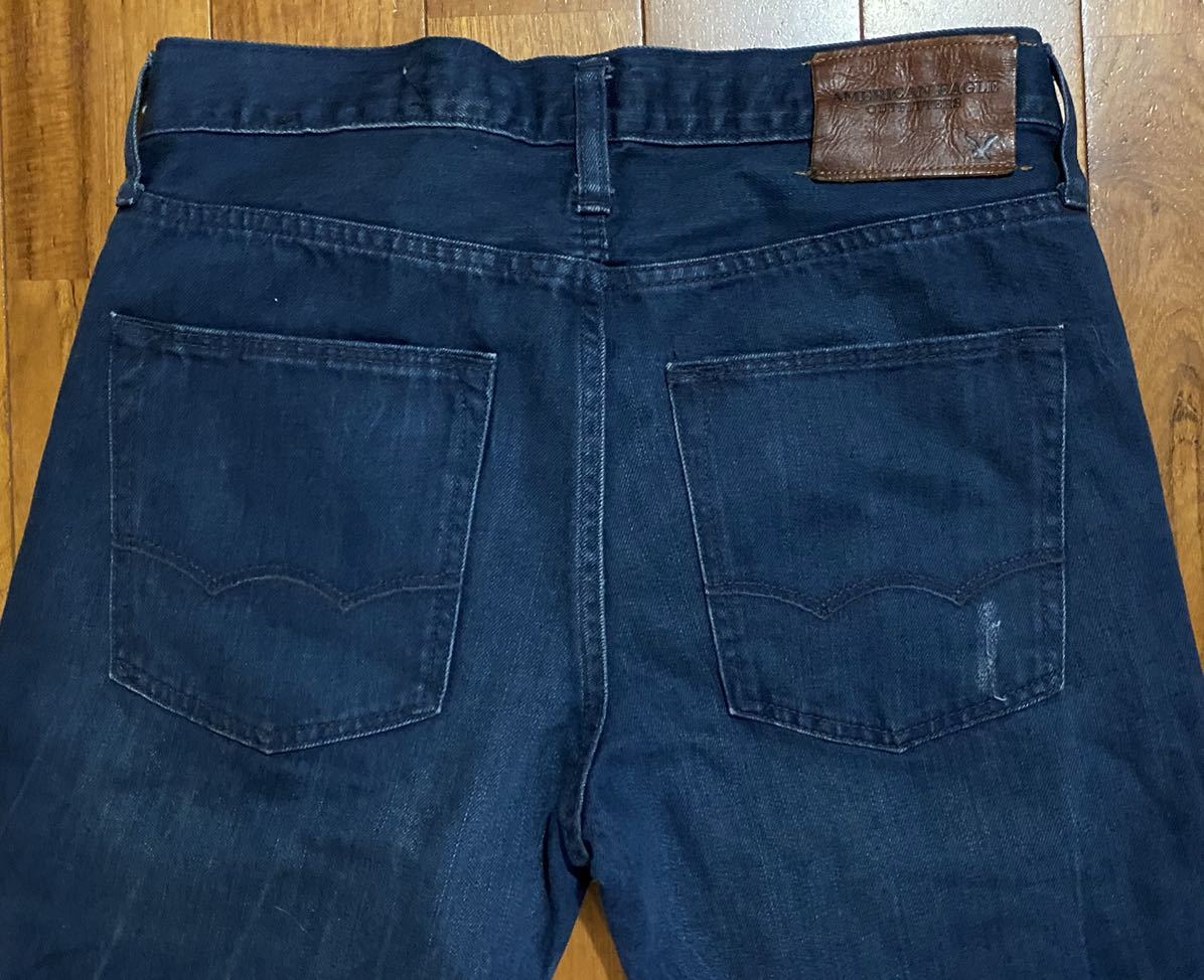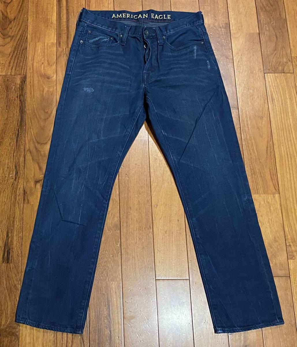 アメリカンイーグルのデニム(ジーンズ)、SLIM STRAIGHTです。色はインディゴブルーです。USEDですが状態は良いです(10段階中8程度)。生地は綿100%です。革パッチ、ボタンフライ、チェーンステッチです。正規品です((株)イーグルリテイリング、中国製)。サイズはW28×L28でウエストは重ねずに平置きで約79cm、ヒップ約96cm、股上約25cm、股下約71cm、股下15cmのふともも部分約50cm、裾まわり約37cm、重量約500gです。発送はゆうパケットポストになります。