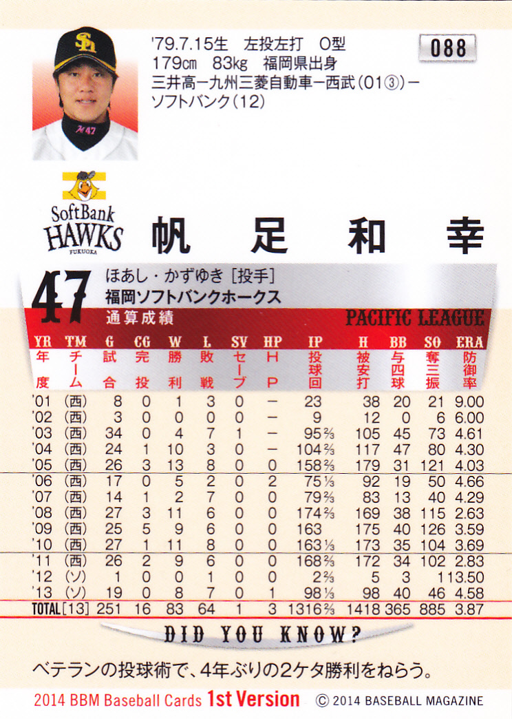 BBM2014ベースボールカード1st 088 帆足和幸 福岡県 三井高校 西武 福岡ソフトバンクホークス