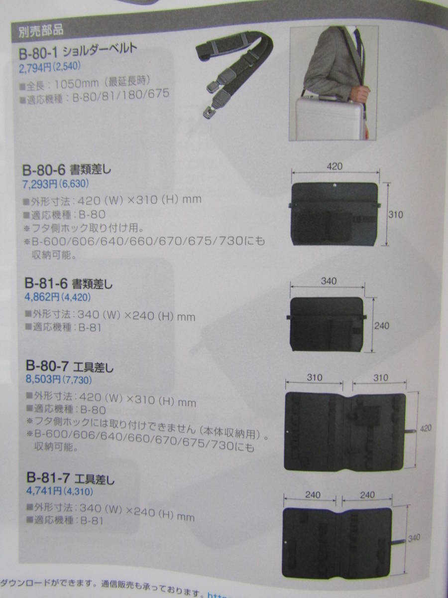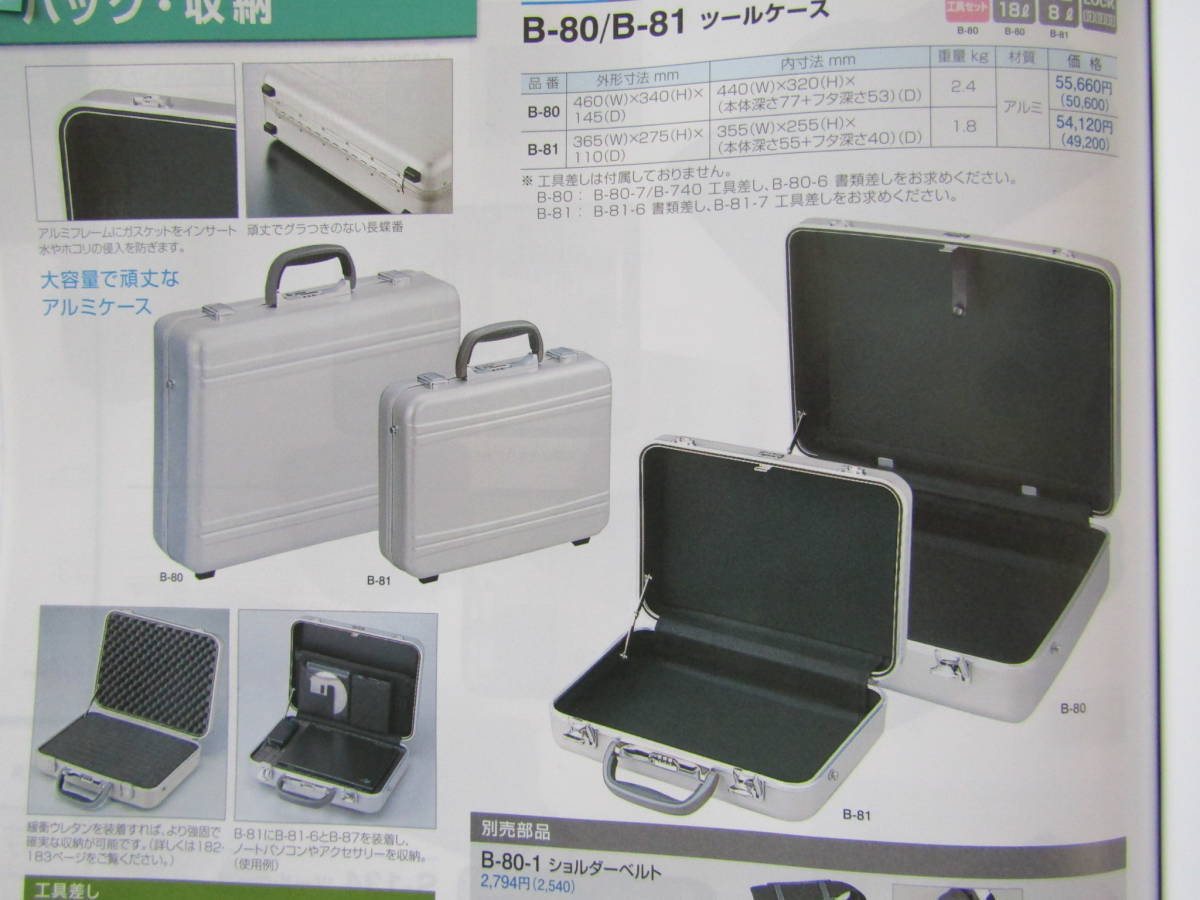 B-80ツールケース外径寸法w440×h320×d145㎜です、数回使用しました。外観は多少キズが有ります(磨けば薄くなるかと)、内部は汚れ無しです。●別売の書類差し,ショルダーベルトが付属します。●個人の好みでSnap-onのステッカーを二ヶ所貼って有ります。●ノークレーム・ノーリターンでお願いします。