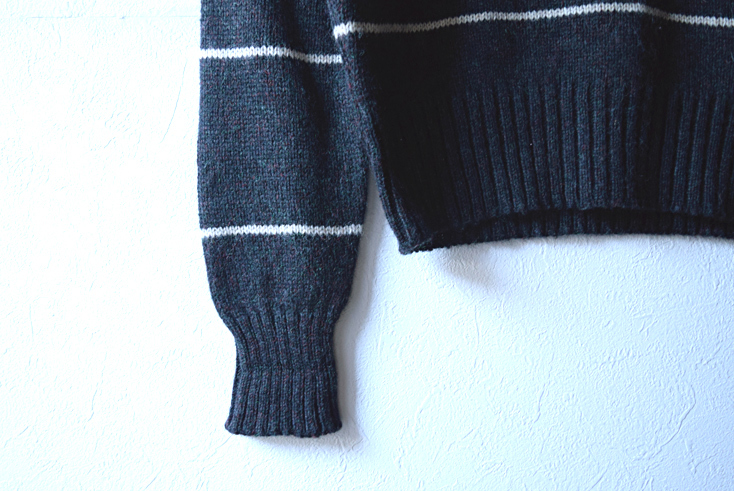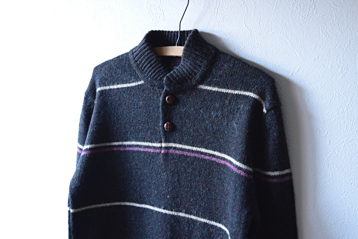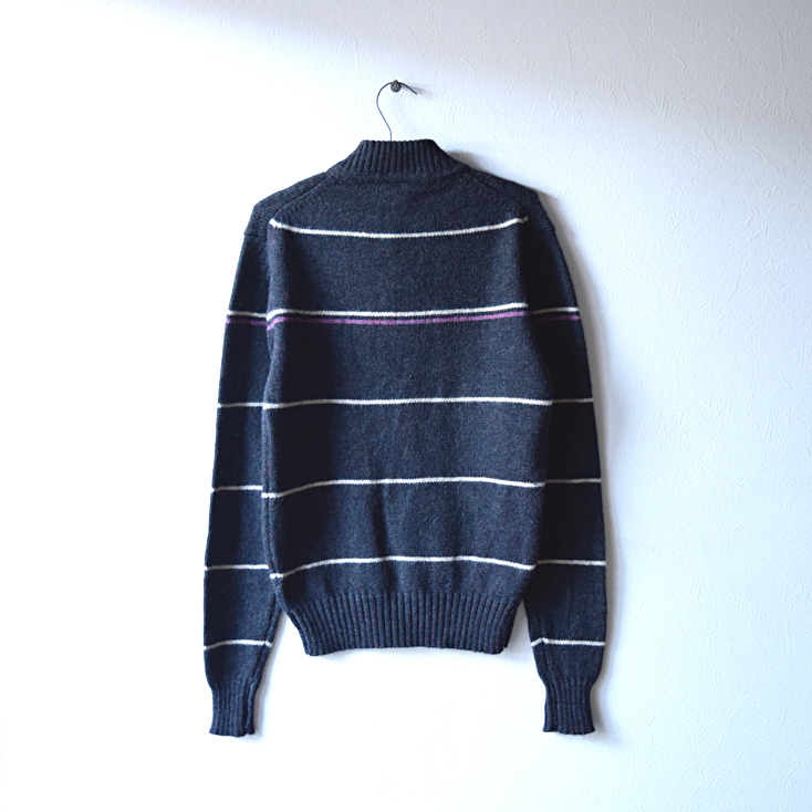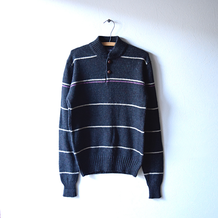 【送料無料】オールド ヘンリーネック セーター シェットランド ウールニット メンズM 黒色 ボーダー柄 CH0427