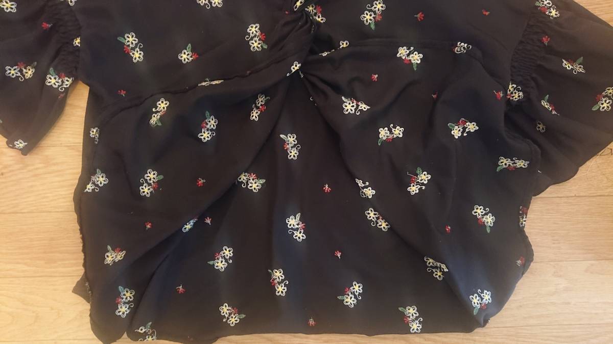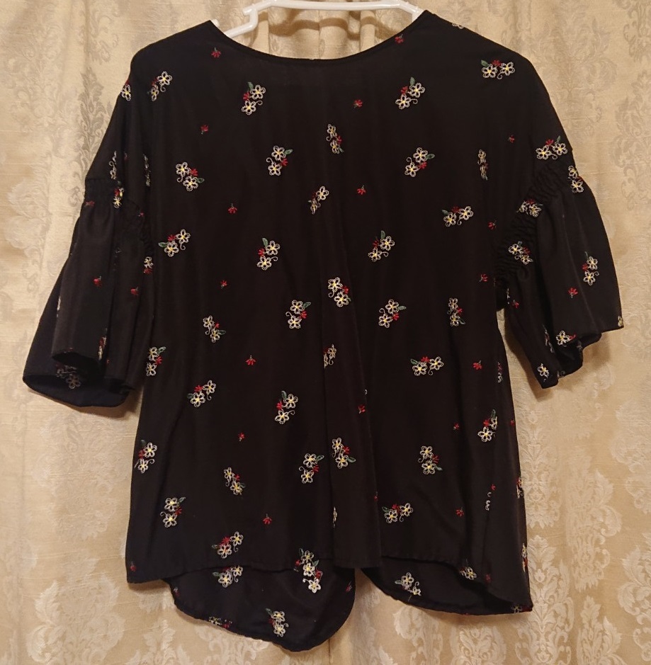 E hyphen world gallery HARU 花柄 トップス 黒 前開 丸首 薄 春夏 半袖 M 送料無料
