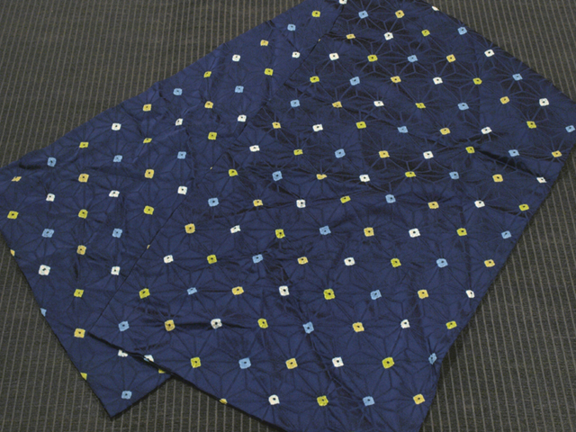 瑠璃紺(るりこん)色の地に麻葉の地紋が織り出され、絞り染めが施されている、綸子のショールです。 星空を思わせるようなお色目がきれいで、かわいらしい雰囲気です。なめらかな手ざわりの綸子地です。 ユーズド品と思われますが、使用感はほとんど感じられません。目につくしみやよごれ、褪色などのダメージもなく、きれいな状態です。 |