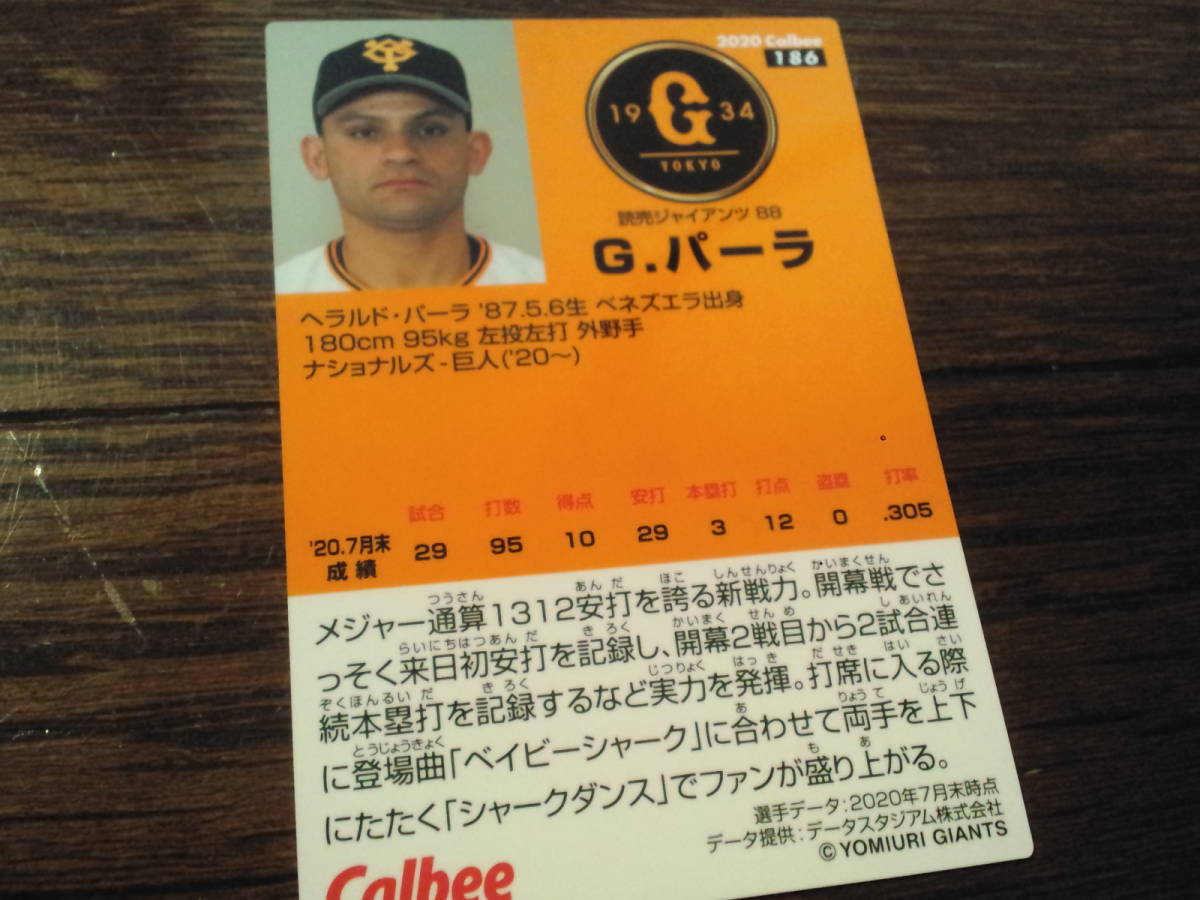 [同梱可]★G.パーラ(読売ジャイアンツ)★レギュラーカード(186)☆2020年カルビープロ野球カード第3弾