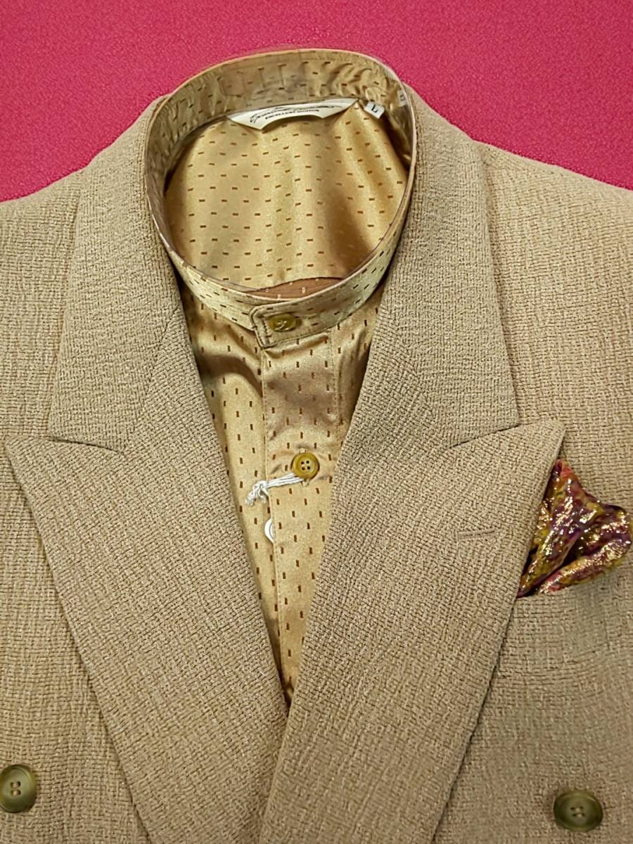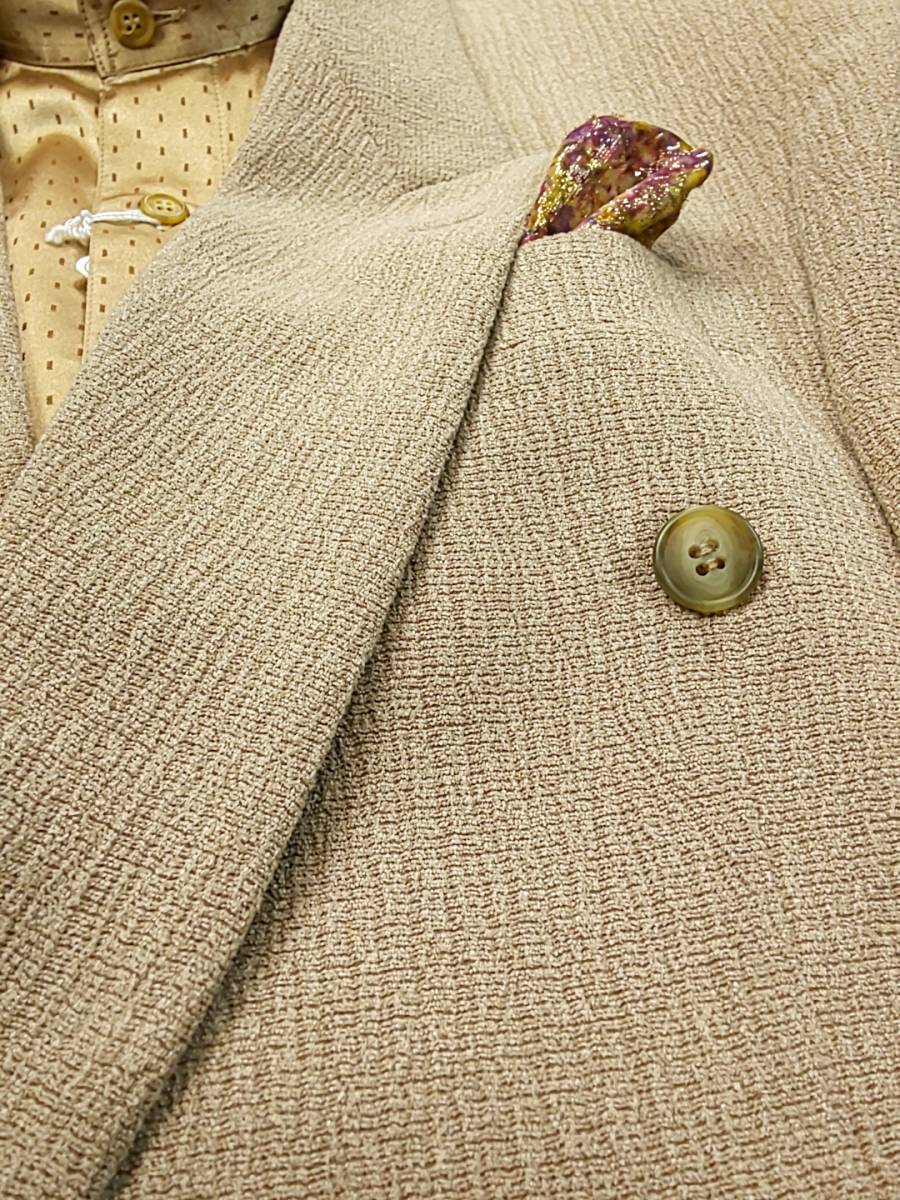 特徴     サラッとした生地でおうとつ感あるオシャレなジャガード織り柄のマオカラースーツです。