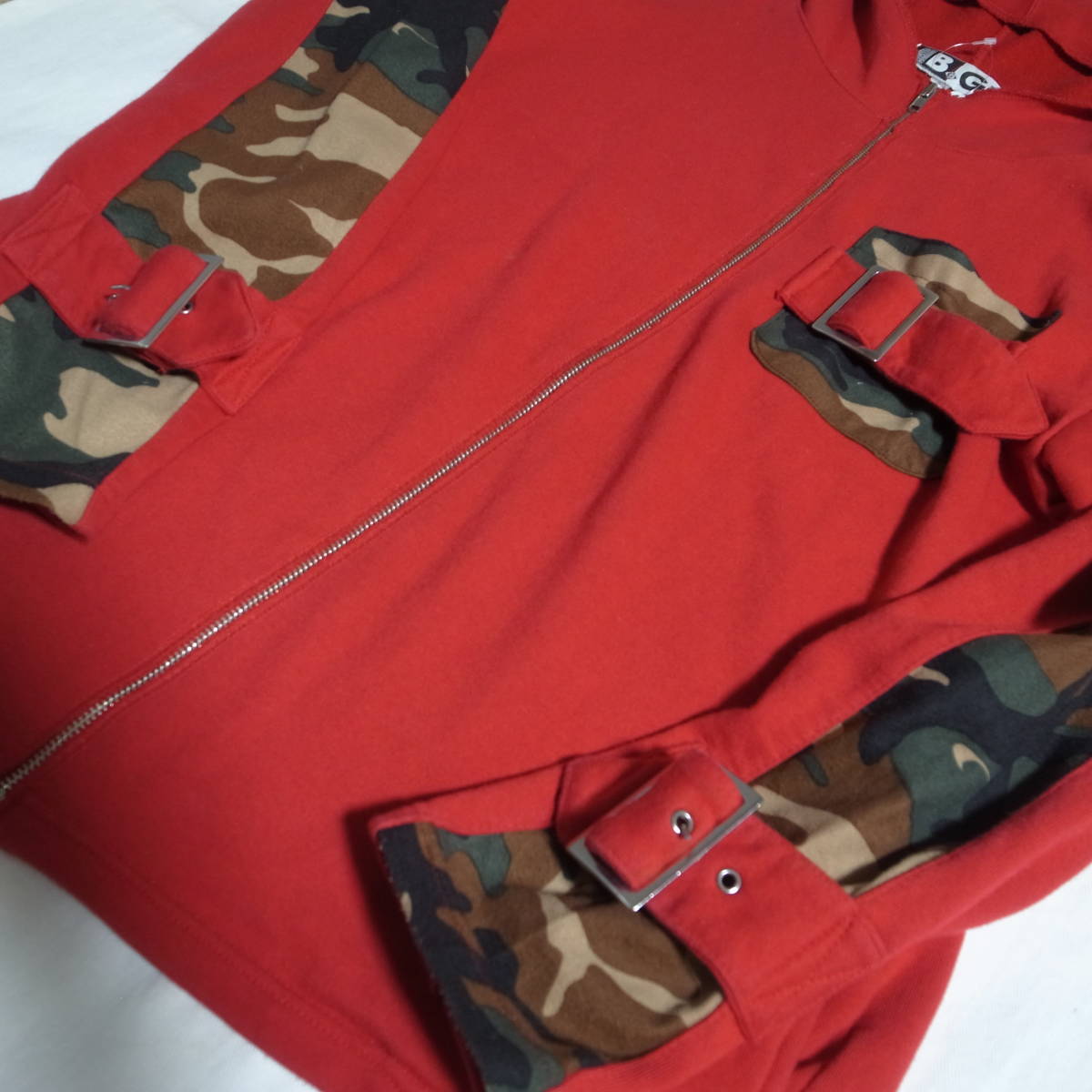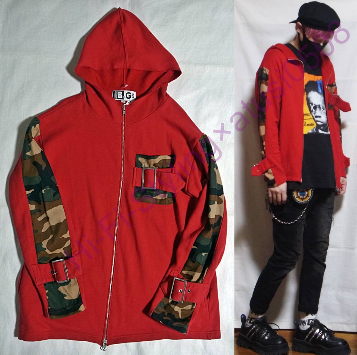 ご回覧ありがとうございます。お手数ではございますがトラブルの元になりますので、説明文は最後までお読み下さい。 着画がある場合のモデルは177×62位の男性です。 こちらはBGのPUNKベルトスウェットジャケット(パーカー)になります。サイズ表記はLです。 色はレッド×カモフラです。 デザイン、カラーリング、シルエット共にとっても素敵です。 女性がオーバーサイズで着られても絶対に可愛いと思いますので彼女との兼用やプレゼントとしても喜ばれるかと思います。 状態はused clothingですが特別なダメージや汚れは見受けられません。普段からコーディネートに古着も合わすお洒落さんなら問題無いかと思います。神経質な方はご遠慮下さいませ。 サイズ表記 L 実寸平置き(背中心着丈 63cm位、脇下身幅 53cm位、肩幅 50cm位、袖丈 57㎝位) ※着画モデルは177×62位の男性です。 特殊なアイテムの素人採寸ですので多少の誤差はご了承の上ご参加下さい。 |