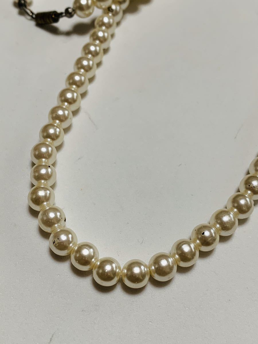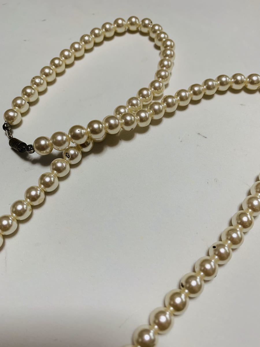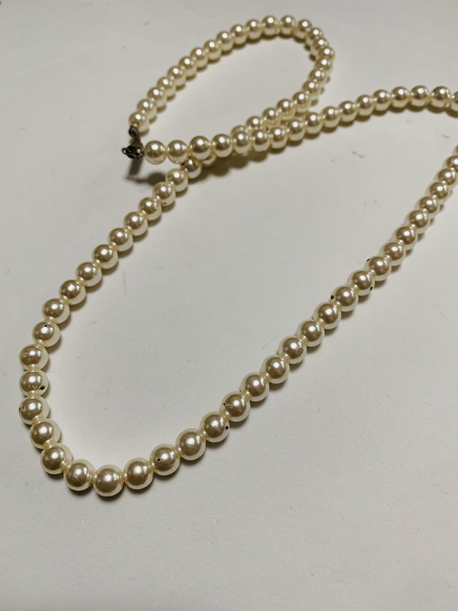 フェイクパールのネックレスです、美しいネックレスですが、パールの玉に4~5箇所に汚れがあります、ひと玉のサイズは直径7ミリ、長さは58センチです