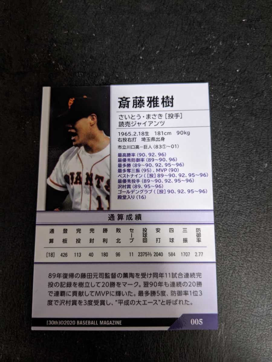 即決★BBM2020 巨人 斎藤雅樹 30th anniversary