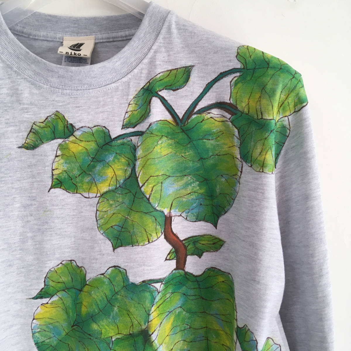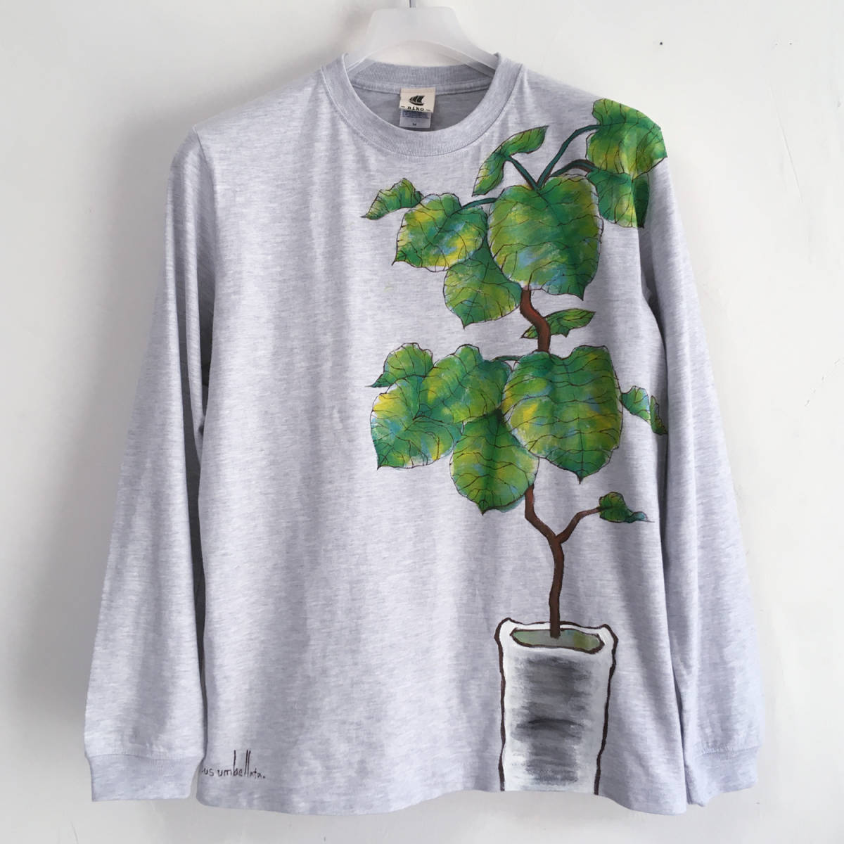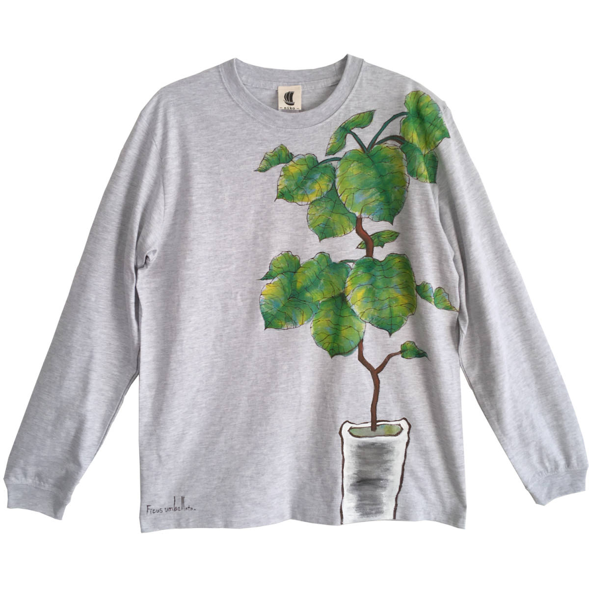 ご覧いただきありがとうございます。 一つ一つ丁寧に手描きで絵付けし、筆跡やカスレなどがプリントTシャツとは一味ちがう手描きならではの味わいとなっております。 ハートの形をした葉っぱがかわいい人気の観葉植物、フィカス・ウンベラータをフロント左かたら裾まで大胆に描いた長袖Tシャツ。 ウンベラータとはラテン語で「日傘」の意味があるそうで、グリーンの涼し気な色合いがデザインのポイントです。 着心地と素材感にこだわった上質なTシャツを使用しているので男性、女性どちらもカジュアルにかっこよく着て頂ける長袖Tシャツです。。。 Tシャツの袖は1.6インチリブ使用、男女兼用で着用できるサイズです。 カラー:アッシュ サイズ:XS XS :身丈62㎝ 身幅46㎝ 肩幅39㎝ 袖丈58㎝ 素材:綿100% Tシャツ素材について:5.6オンス 胴仕上げ 首リブはダブルステッチ しっかりふっくらとした生地のハイクオリティな長袖Tシャツ、繰り返しの洗濯にもよれないコシのあるリブはTシャツ好きさんには納得していただける素材のTシャツを使用しております。 | |||