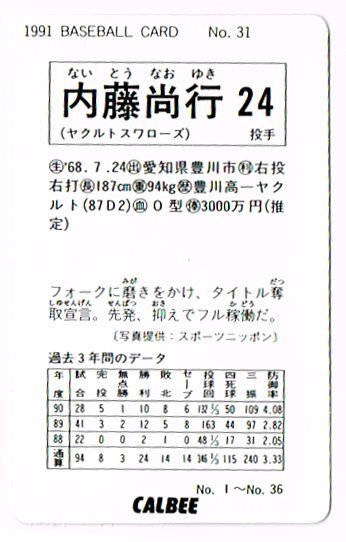 プロ野球カード 91◆内藤尚行 ヤクルトスワローズ No.31 カルビー