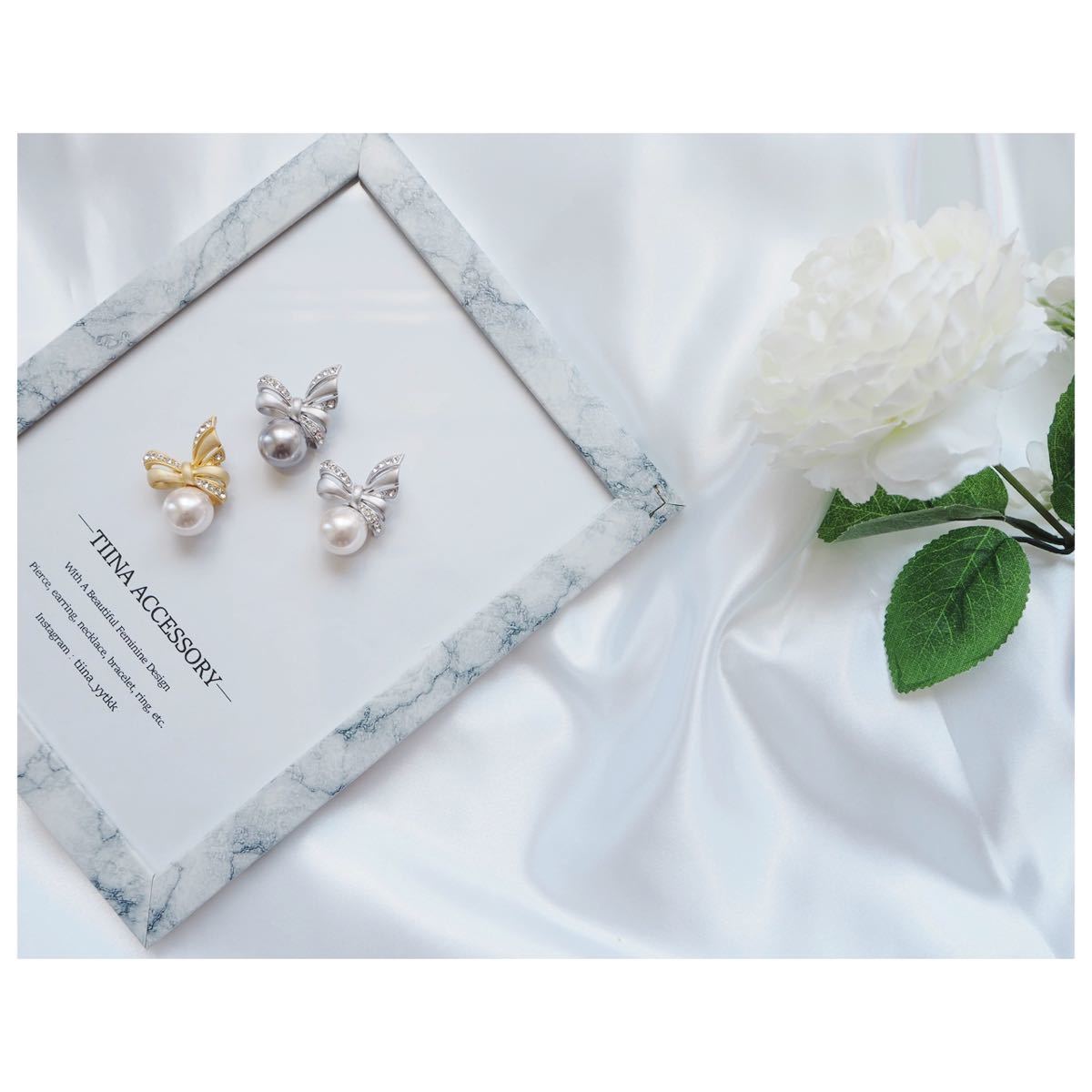 マット調素材のリボンとパールが組み合わさった上品デザイン。